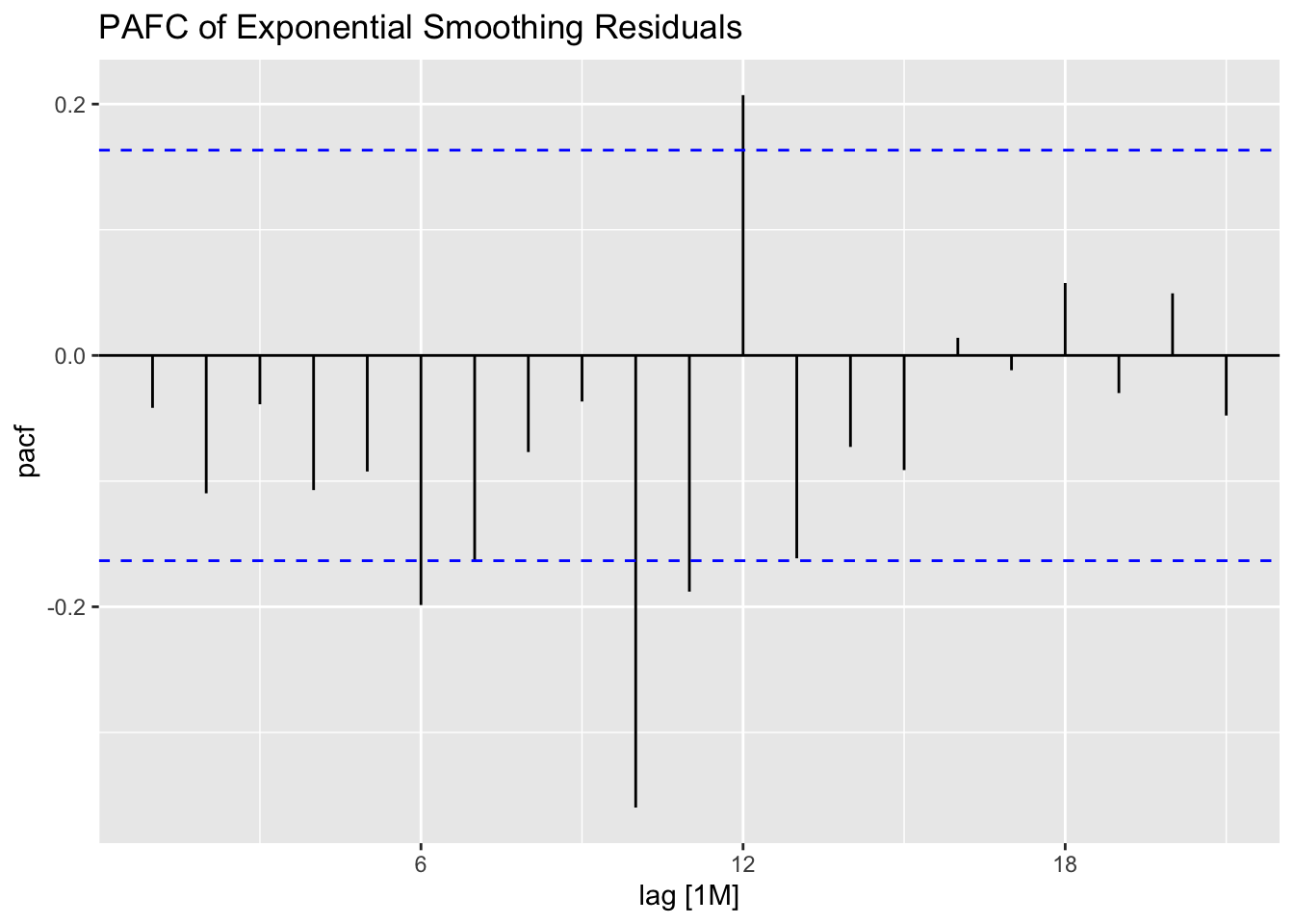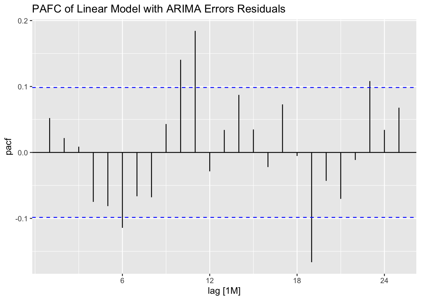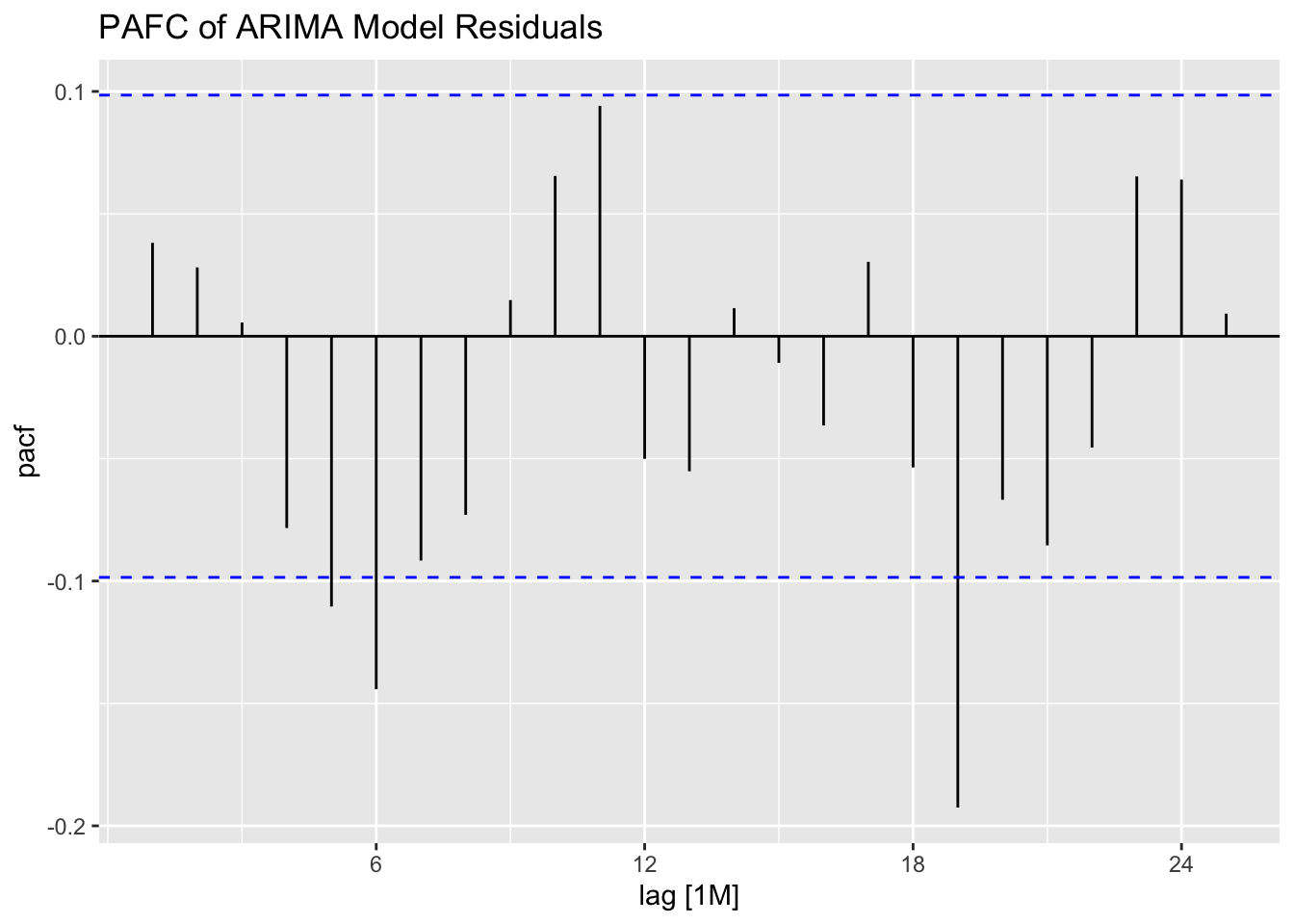 labs(title = "PACF Plot of the Residuals of the ARIMA(0,1,1)(2,1,1)[12] Model")