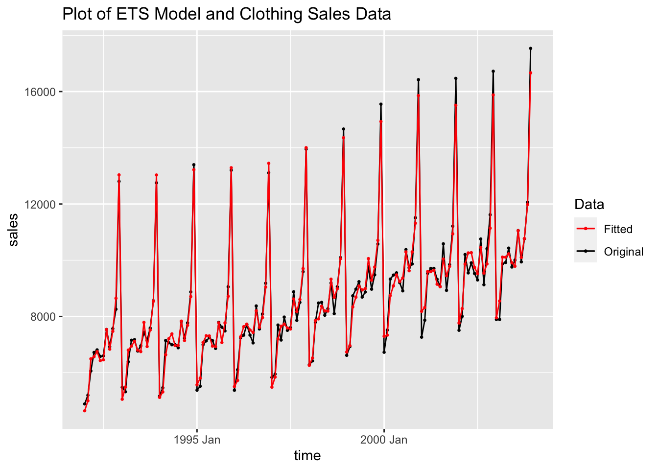 labs(title = "Plot of ETS Model and Clothing Sales Data",