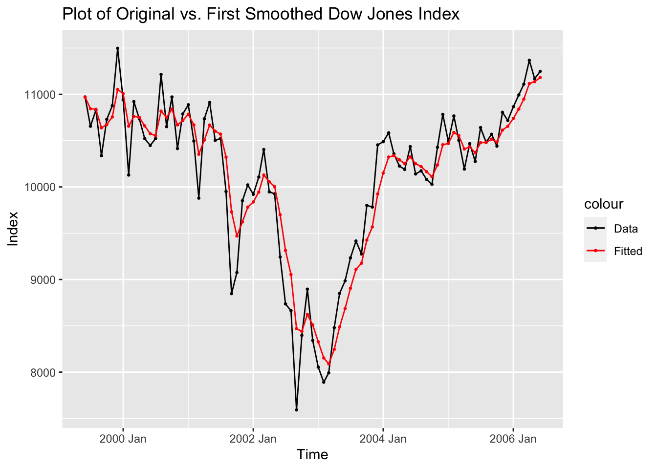 This is a linear combination of the current observation (\(y_{T}\)) and the smoother observation at the previous time unit (\(y_{T-1}\)).