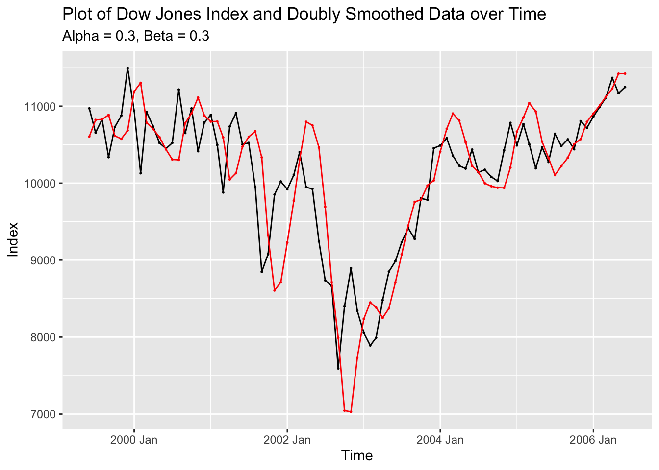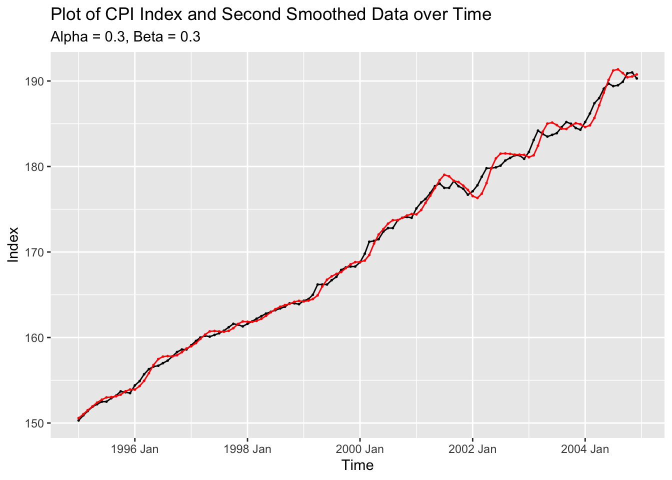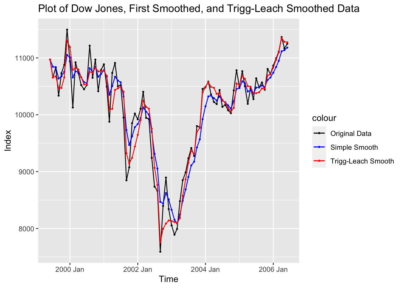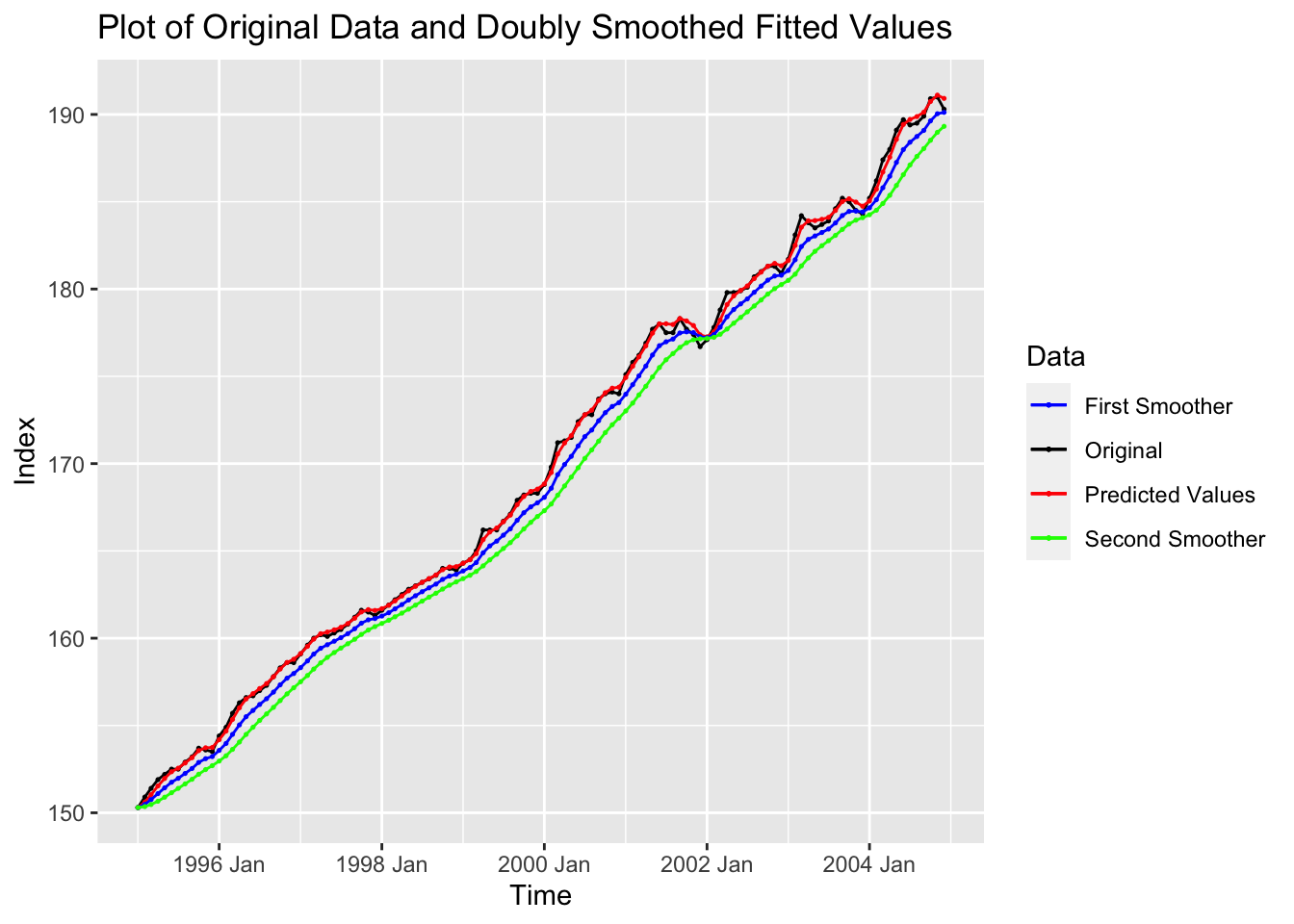Let \(\tilde y_{T}^{(1)} =\) first-order smoothed exponentials, and \(\tilde y_{T}^{(2)} =\) second order smoothed exponentials.