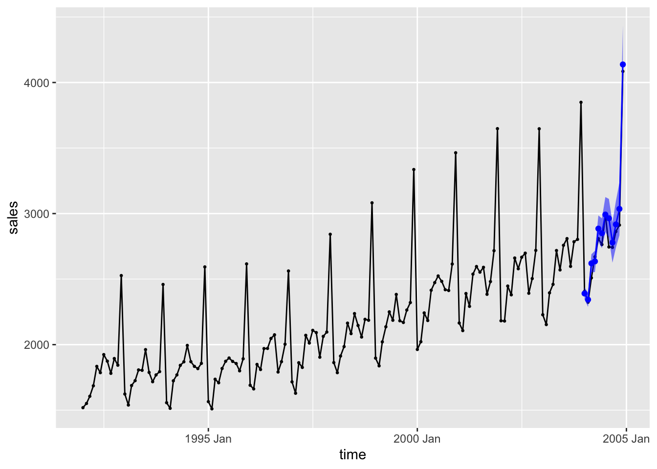 liquor.fc <- forecast(liquor.fit, new_data = liquor |> filter(year(time) == 2004))
