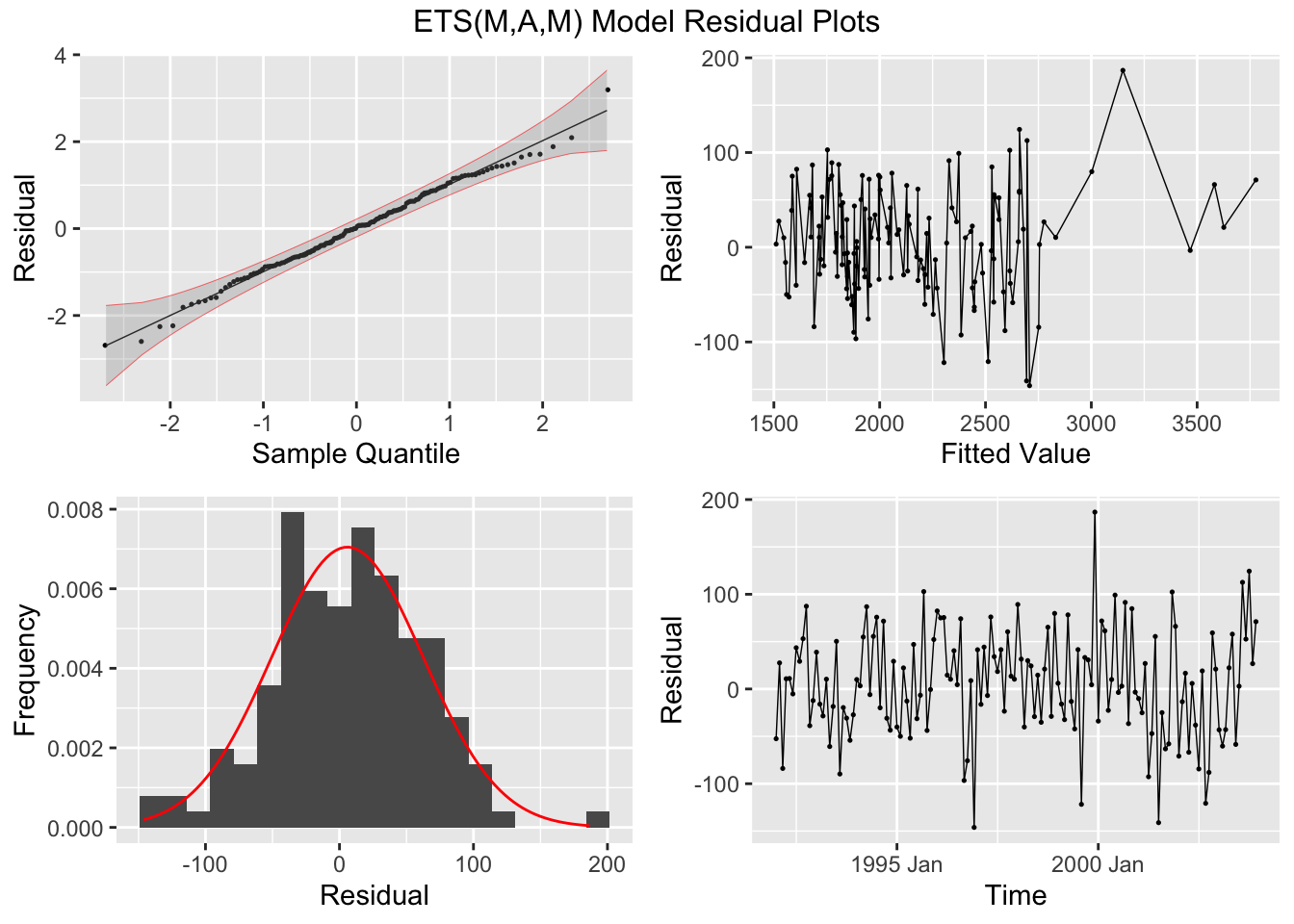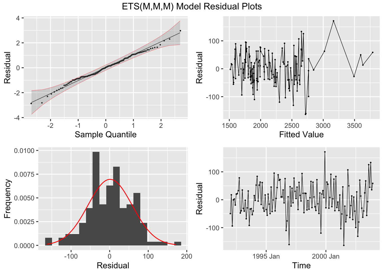 plot_residuals(augment(liquor.fit |> select(multiplicative)), title = "ETS(M,M,M) Model")