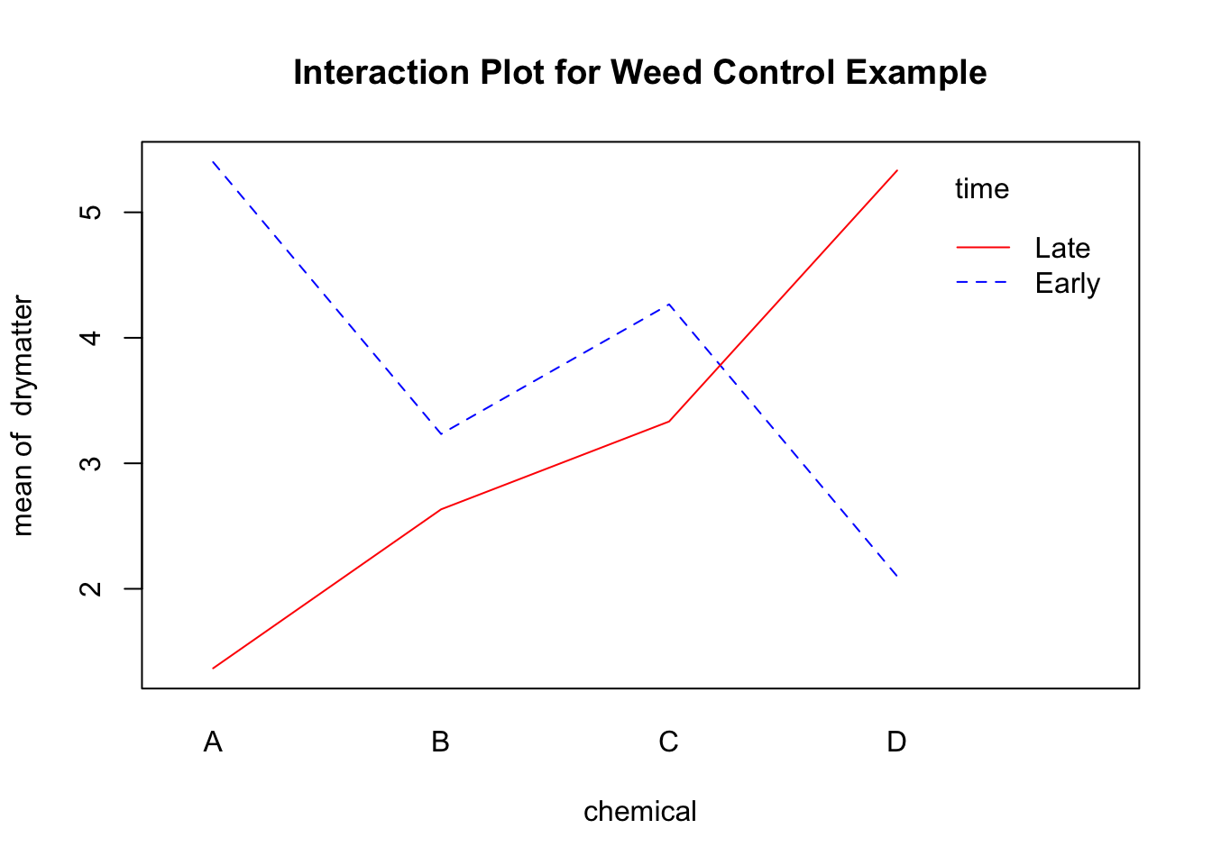 The differences between the chemicals clearly depend on whether the application occurred during the early or late stage of growth. If application is in the early growth stage, chemical D appears to be more effective as it produces much less dry matter of weed; but if application is in the later growth stage it is chemical A which is more effective, and chemical D is the worst of the chemicals (weeds treated with D have a high average production). The effect of chemicals interacts with the time of application – the effect of the chemicals depends on which time of application is being considered.