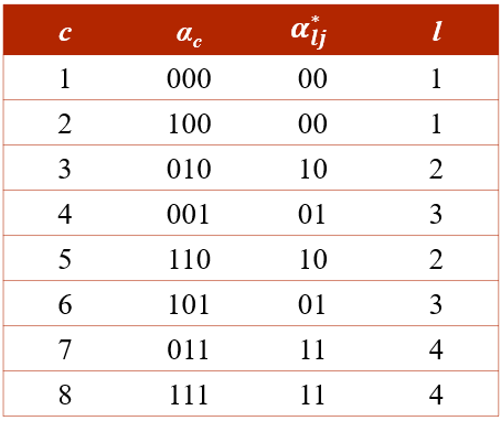 Assume \(K=3\) and \(K_j^*=2\), we have \(2^3\) latent classes can be collapsed into \(2^{K_j^*}=4\) latent groups: