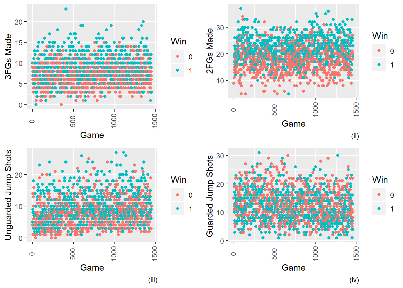 Below are summary statistics of the Shots dataset (features and associated description are given in Table 1.3). From this we can see that on average, teams take more guarded shots than unguarded shots. Teams also take more long jump shots on average compared to short or medium jump shots. The average FG% from all teams from all 1488 games in the dataset is 27.75/68.1 = 40.75%. Teams on average attempt 25 3-Pointers and make about 8 per game which gives an average 3FG% of 32%; 2-Pointers have a higher efficiency on average because they are easier to score. Total Points are negatively correlated to guarded jump shots, short jump shots and medium jump shots, and are positively correlated to long jump shots (3 Pointers). It is self-explanatory that total points are negatively correlated to guarded shots as these have a higher likelihood of being missed. On the other hand, it is interesting to note that teams with players that take more short and medium jump shots as opposed to long shots have less total points, while teams with players taking more long jump shots have more total points. This shows that players with good 3-point shooting efficiency are highly valuable to a team and may in fact be an important factor to a team’s season performance.