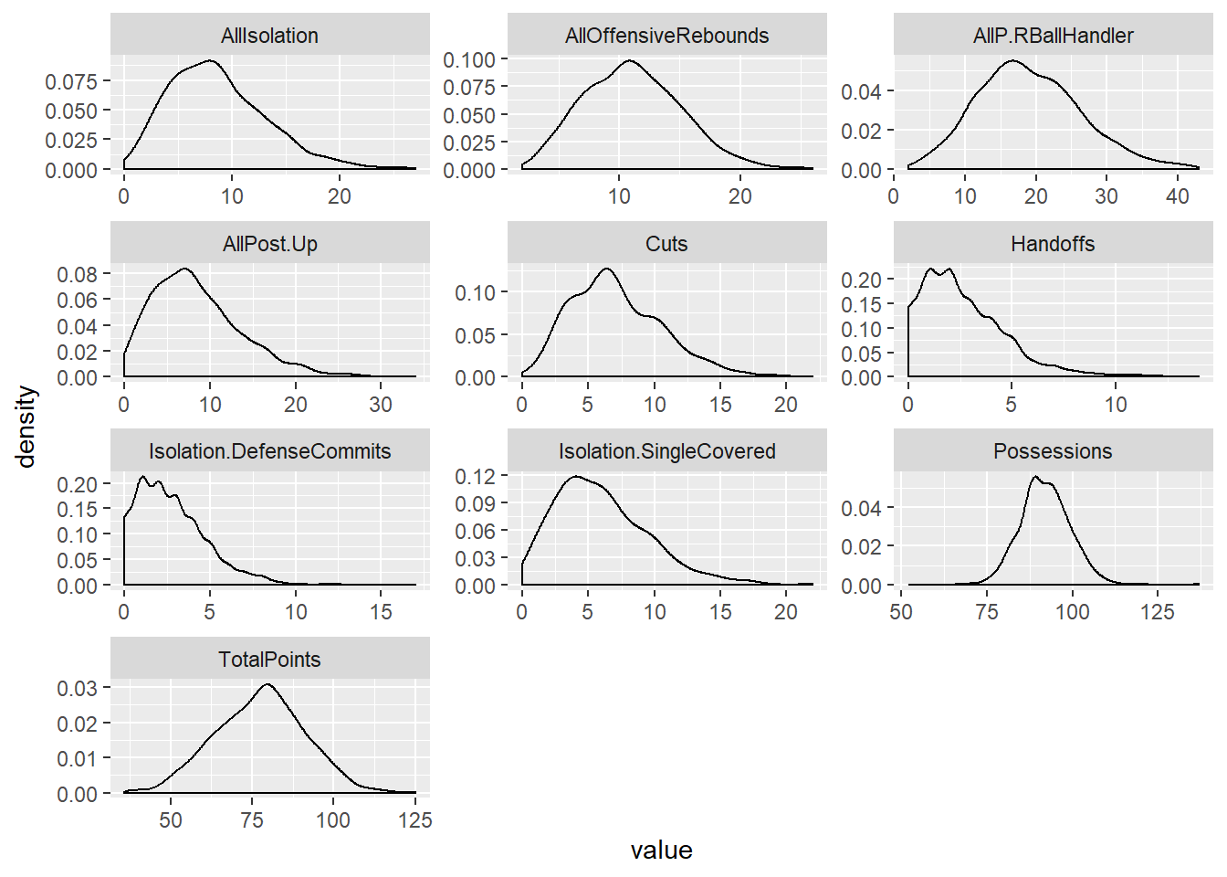 The distributions of most of the Isolation, Post-Up and Pick and Roll plays are skewed to the right, along with Handoffs, Offscreens and Miscellaneous Posssessions. The rest of the plays are approximately normal.