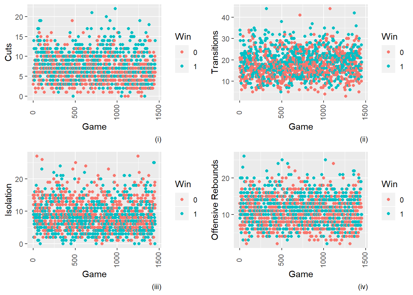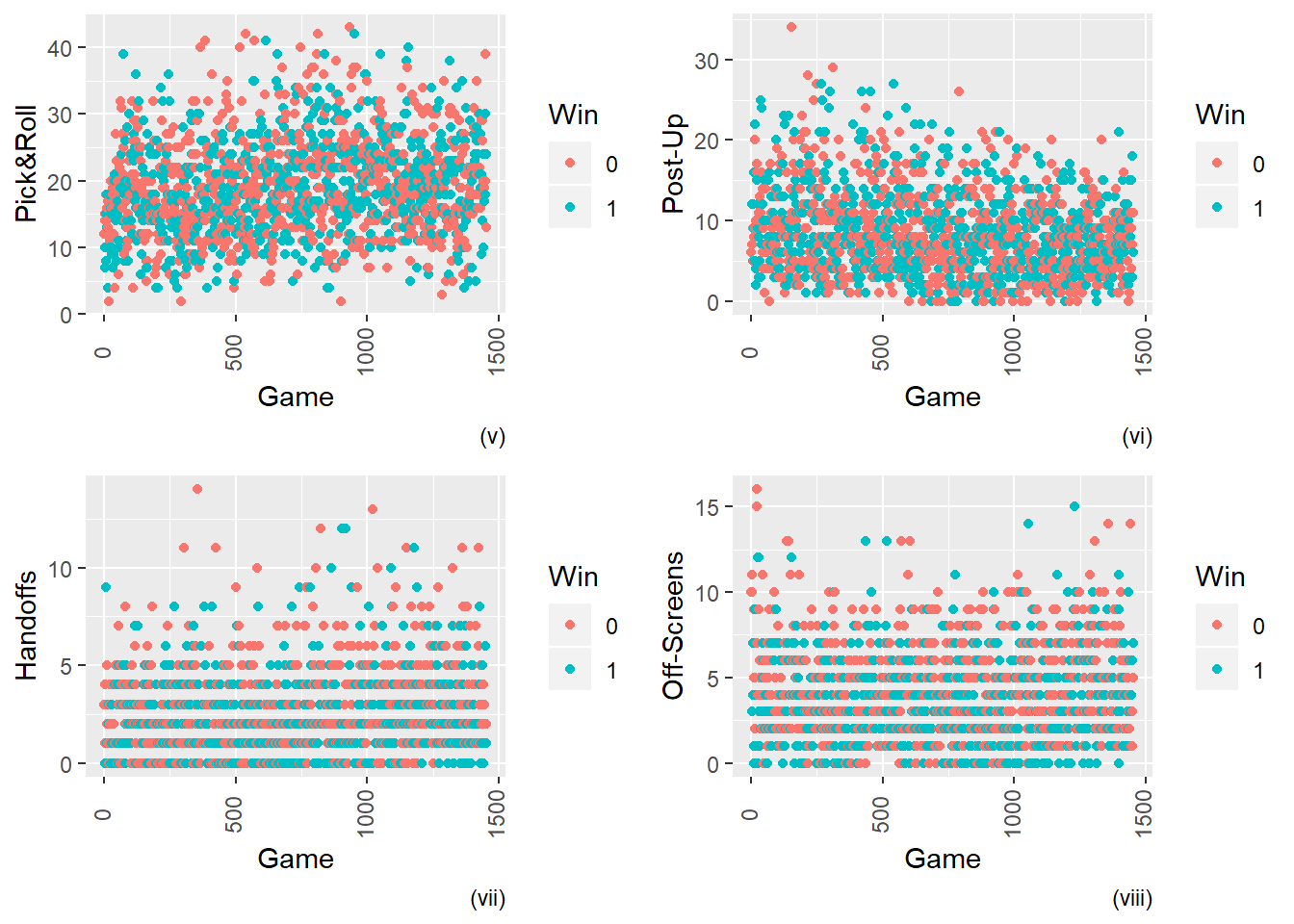 Figure 2.2: Scatterplots of certain Play Types vs. Wins (1) or Losses (0)
