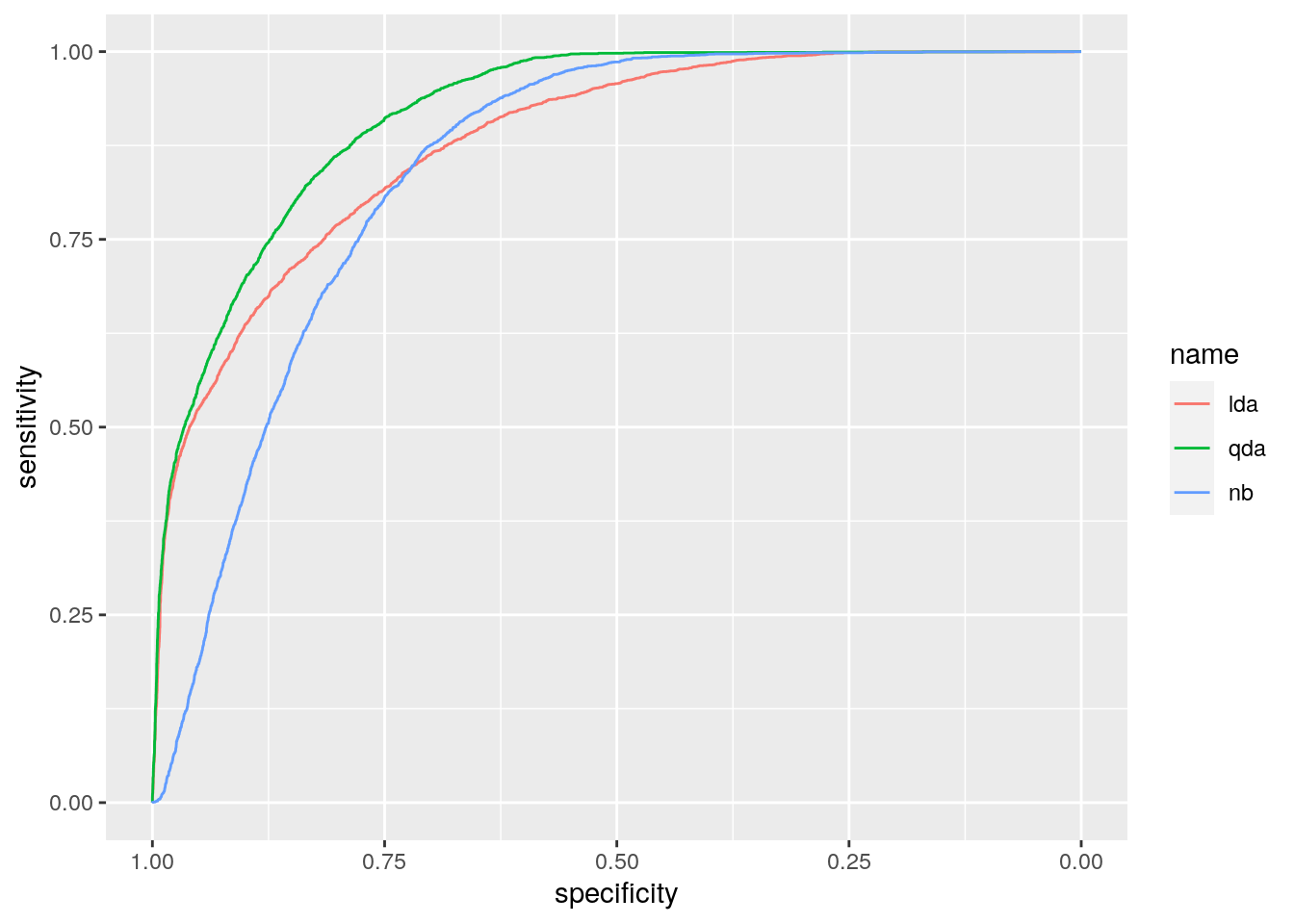 Compute and plot the ROC curves for all the estimated models (lda, qda and nb). For which model do we obtain the highest area under the ROC curve?