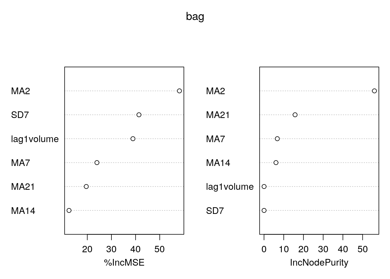 The left plot reports the % increase (averaged across all \(B\) trees) of MSE (computed on the OOB samples) when a given variable is excluded. This measures how much we lose in the predictive capability by excluding each variable. The most important regressor, considering all the \(B\) trees, is MA2.