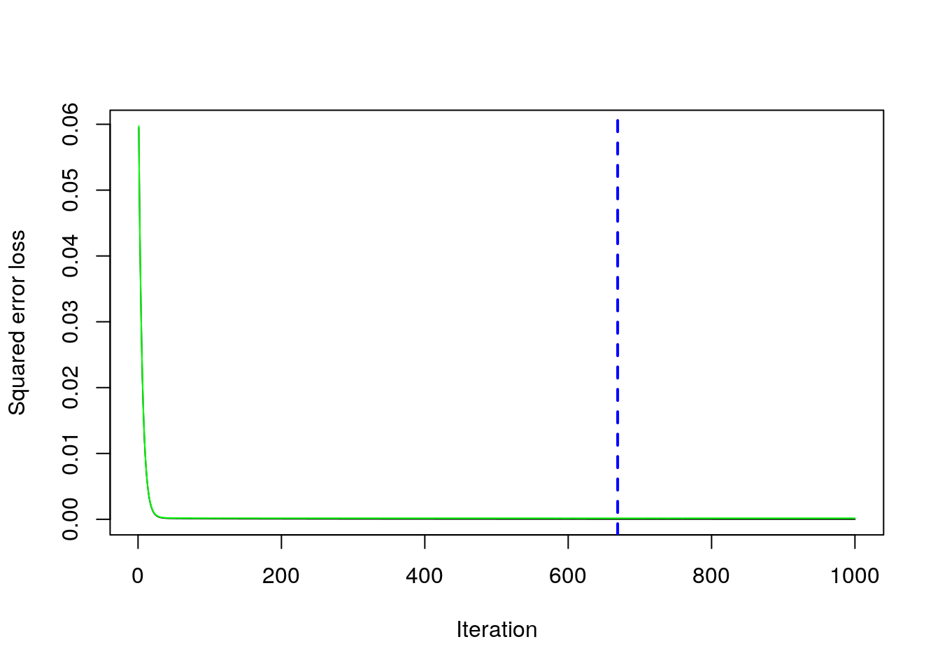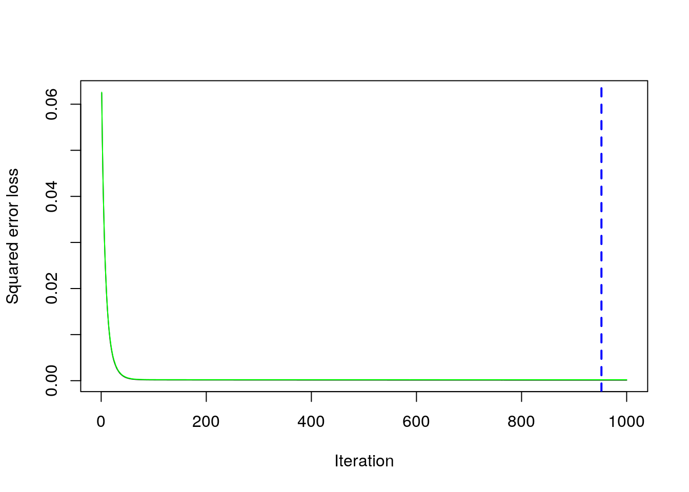cv.folds = 5) We are now interested in exploring the content of the vector cv.error contained in the output object boost: it contains the values of the CV error (which is an estimate of the test error) for all the values of \(B\) between 1 and 1000. For this reason the length of the vector is equal to \(B\):