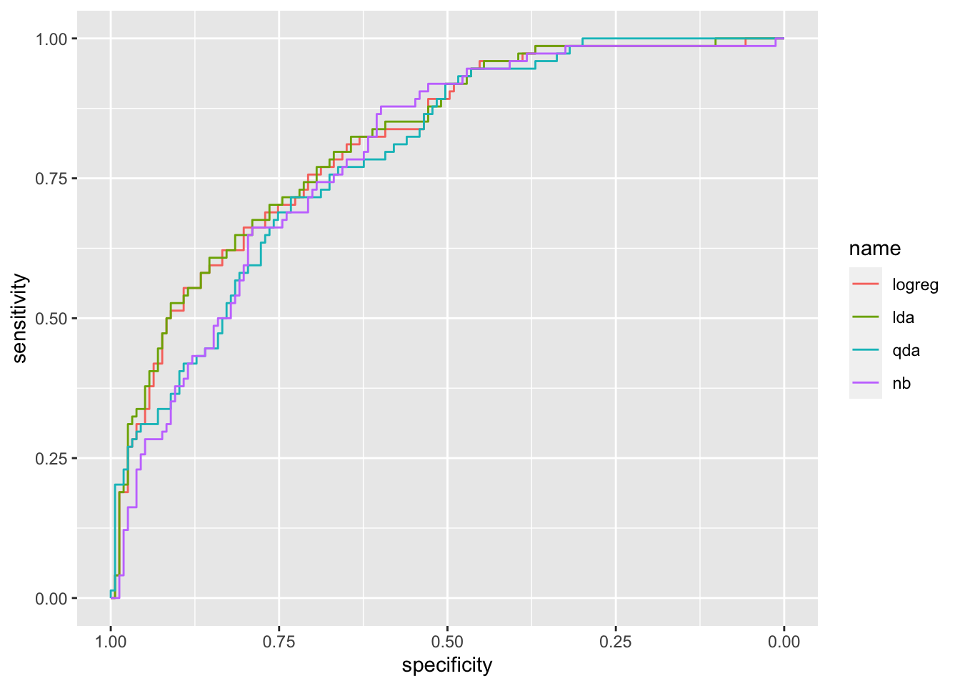 It can be observed that the ROC curve lies below the other two curves meaning that QDA performs worse. Let’s compute the auc for the three methods: