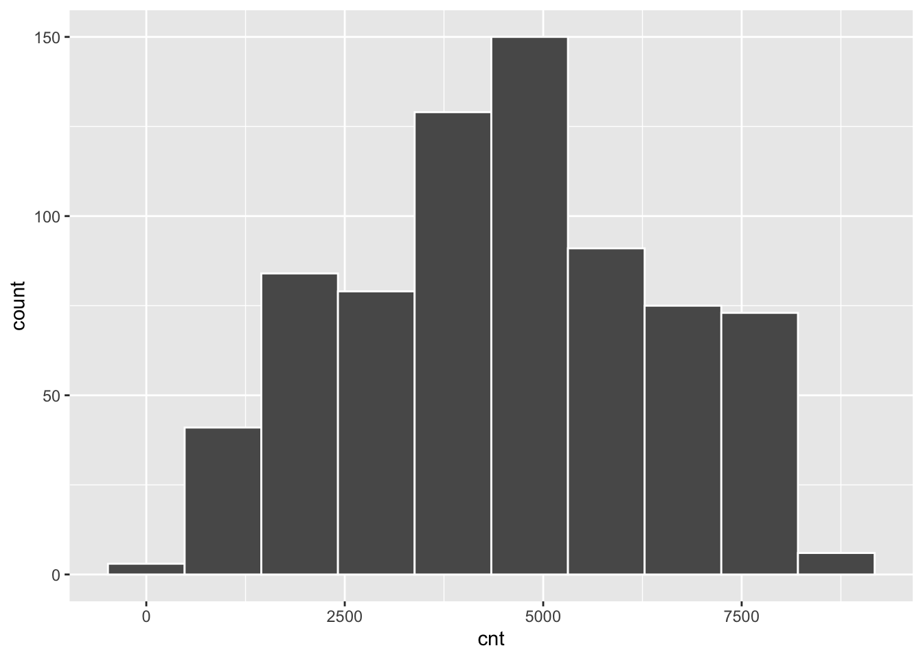 summary(bikesharing$cnt)## Min. 1st Qu. Median Mean 3rd Qu. Max.