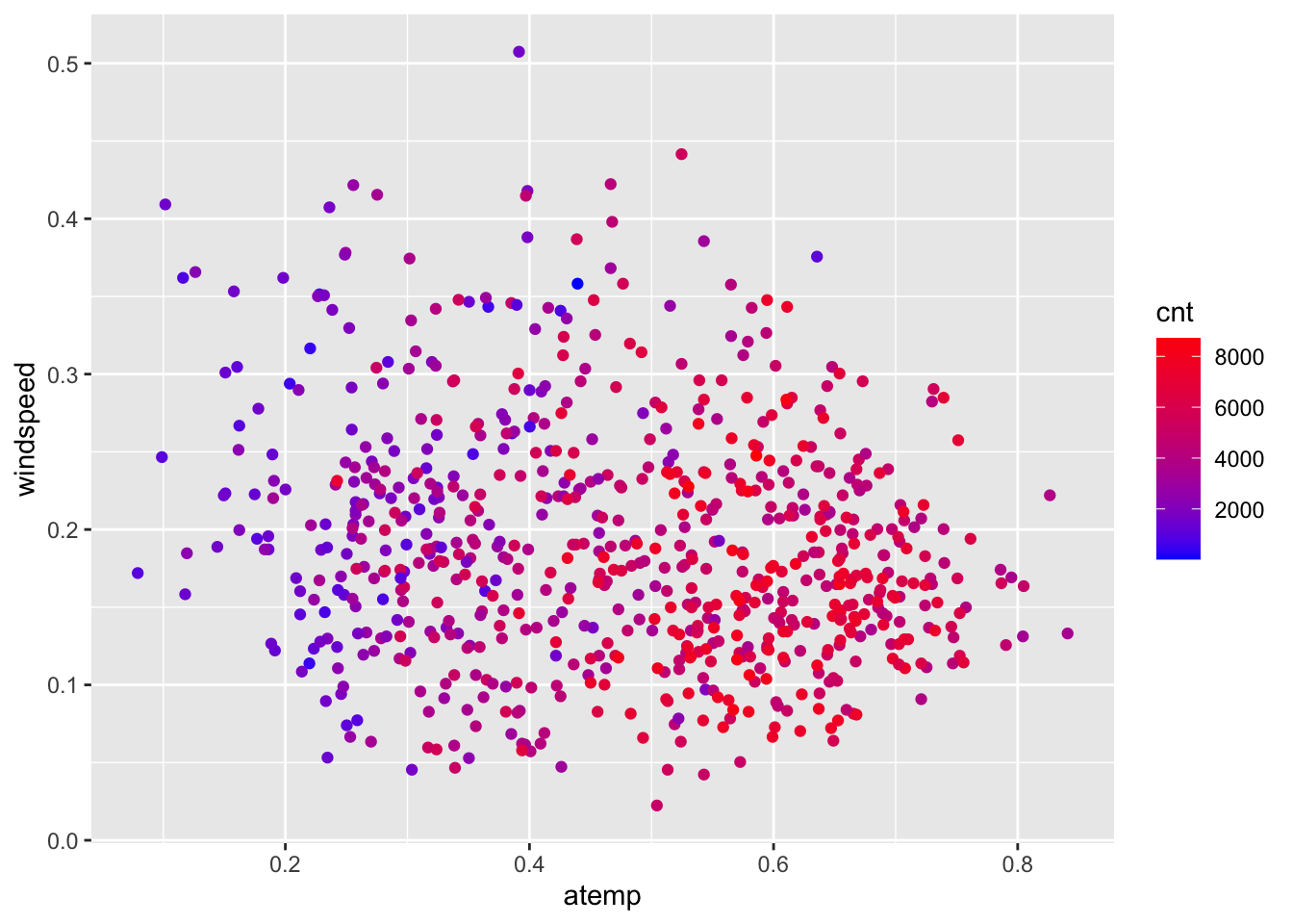 geom_point(aes(x=atemp,y=windspeed,col=cnt))+