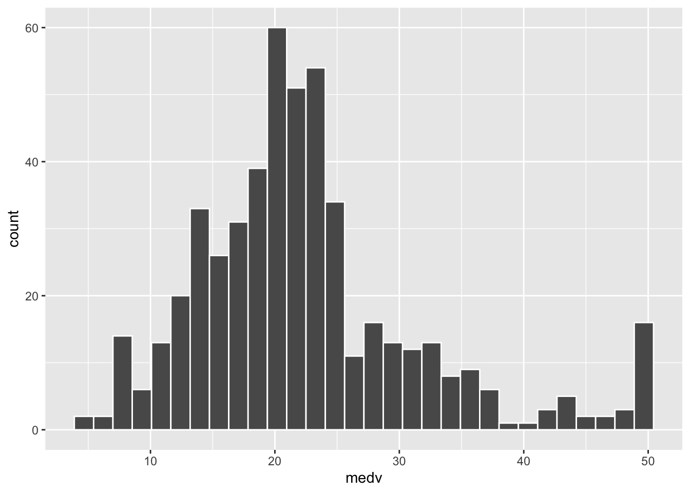 geom_histogram(aes(medv),col="white")## `stat_bin()` using `bins = 30`. Pick better value with `binwidth`.