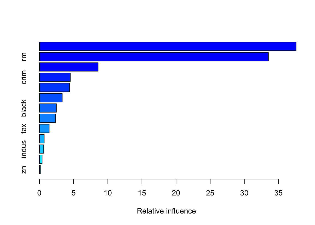 The relative influence of each variable is reported, given the reduction of squared error attributable to each variable. The second column of the output table is the computed relative influence, normalized to sum to 100.