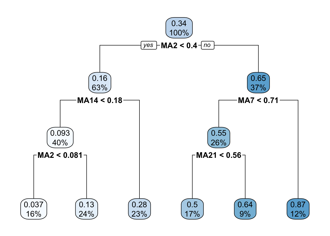 ## 2) MA2< 0.4017356 729 7.8698120 0.16016720