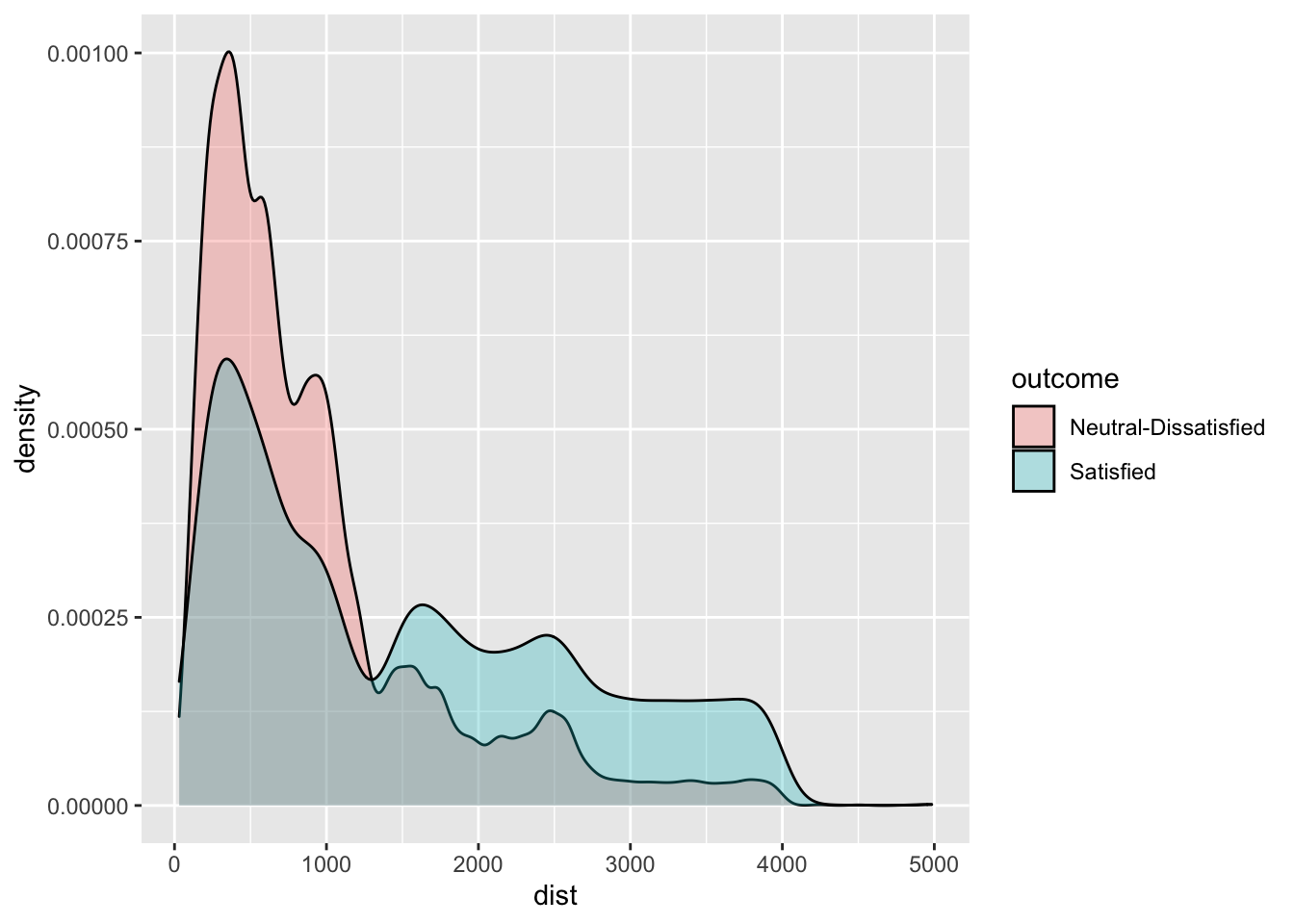 Some exploratory analysis can be done to study the distribution of the regressors conditionally on the satisfaction condition. We consider here, as an example, Age or Distance: