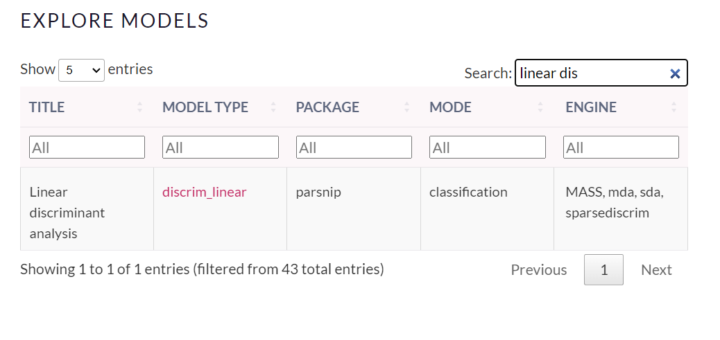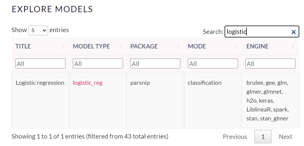 For implementing the logistic regression the function logistic_reg() is used. It requires the specification of the engine, and the mode as you can see in the picture taken from https://www.tidymodels.org/find/parsnip/: