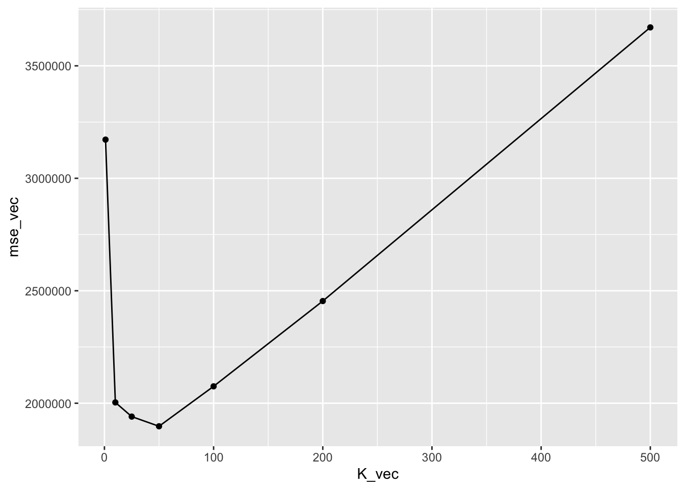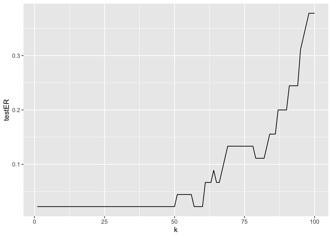 }To plot the test error rate as a function of \(K\) by using ggplot we can proceed as follows: