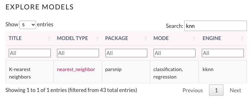 In R there could be several packages that fit the same type of model. For example KNN can be implemented by using the kknn and FNN package. Note that each package is unique in the way it defines the function (and its arguments) for model fitting. tidymodels represents an interface to these packages (named engine) implementing the same model. At the link https://www.tidymodels.org/find/parsnip/ you can find all the models (and corresponding engines) that can be implemented using tidymodels. In this lab we are interested in KNN, thus we searched for KNN at the previous link. The following picture shows that the tidymodels function we will need is called nearest_neighbor and the engine that will be used is kknn. This means that the kknn package is also required for this lab.