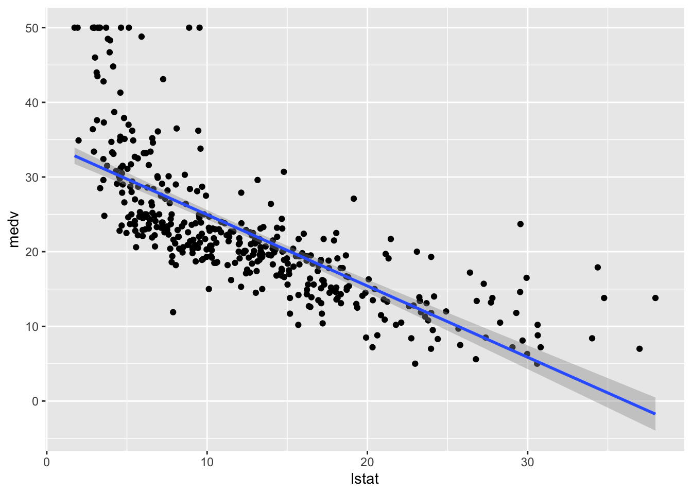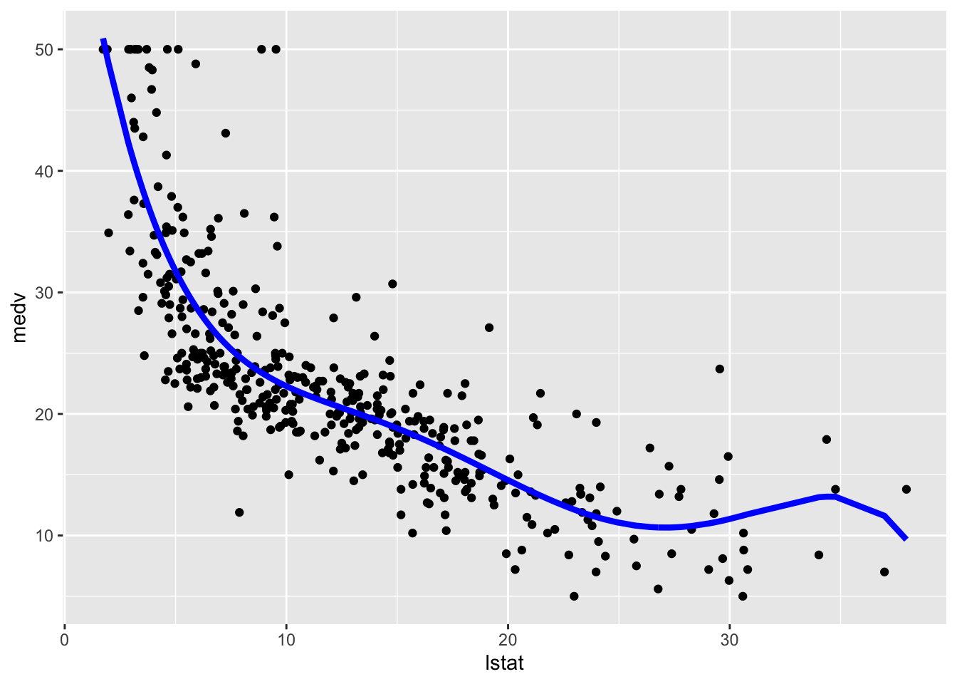 We consider lstat (lower status of the population (percent)) as the only regressor/covariate and medv (median value of owner-occupied homes in $1000s) as response variable. The relationship between the two variables is shown in the following scatterplot: