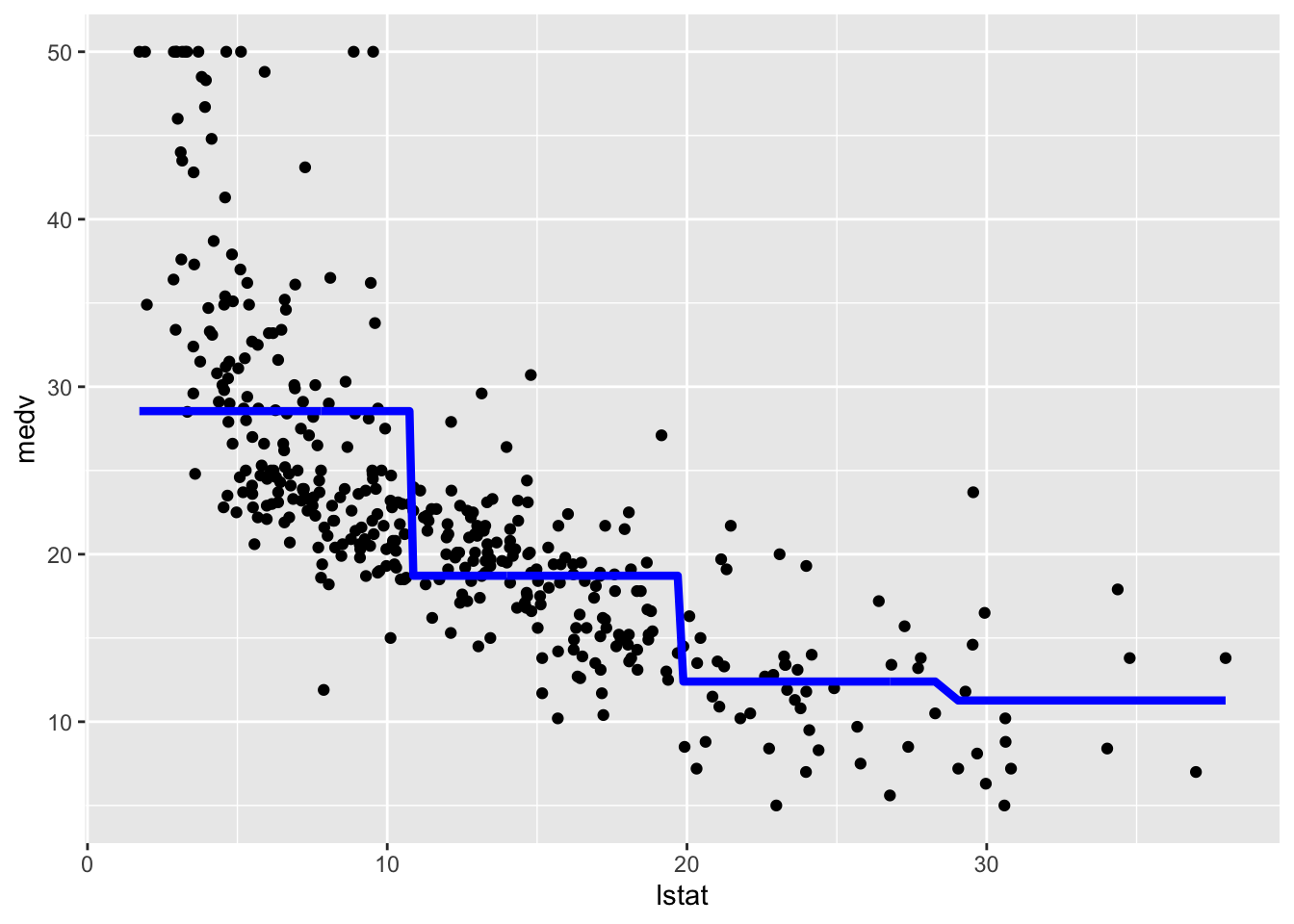 We consider now the case of a linear regression model with step functions defined by the classes of lstat_ord. In this case a constant model will be estimated for each of the 4 regions. We don’t have to do anything special in this case apart from specifying a standard linear model where lstat_ord is the only regressor. R will take care of creating the corresponding three dummy variables (remember that the baseline category is absorbed by the intercept):