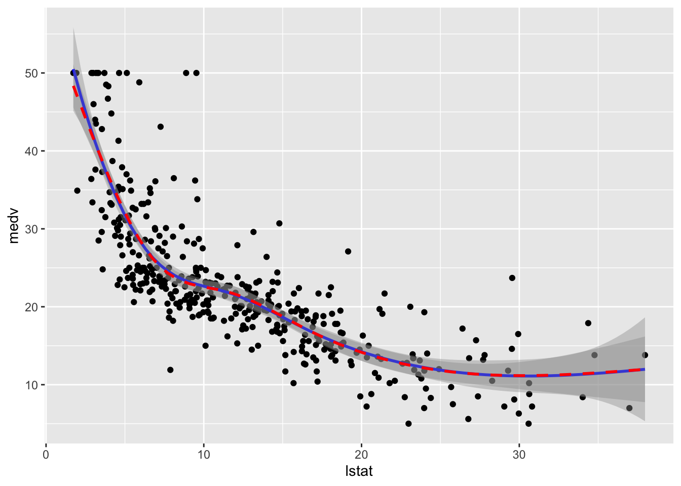 We plot the fitted model with the two methods. Note that for using geom_smooth it is necessary to specify by means of formula that we are using a transformation of x=lstat: