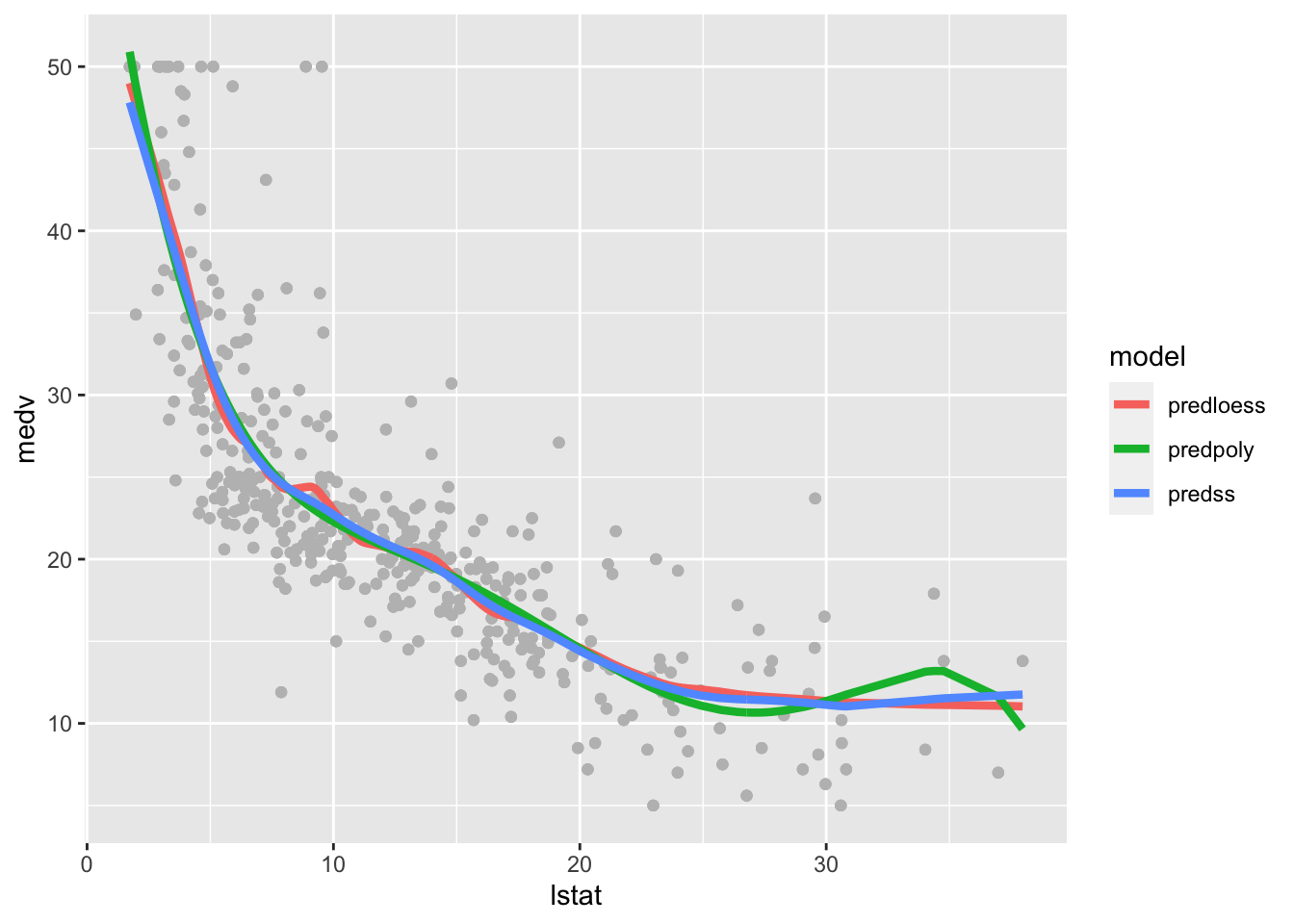 We now plot the 3 fitted models. Note that in this case it is not possible to use the geom_smooth function, so we proceed with the second method for plotting. Moreover, note that in this case it is not possible to use the $fitted.values option because smooth.spline works differently. We have instead to apply the fitted function to the smooth.spline outputs in order to obtain the fitted values: