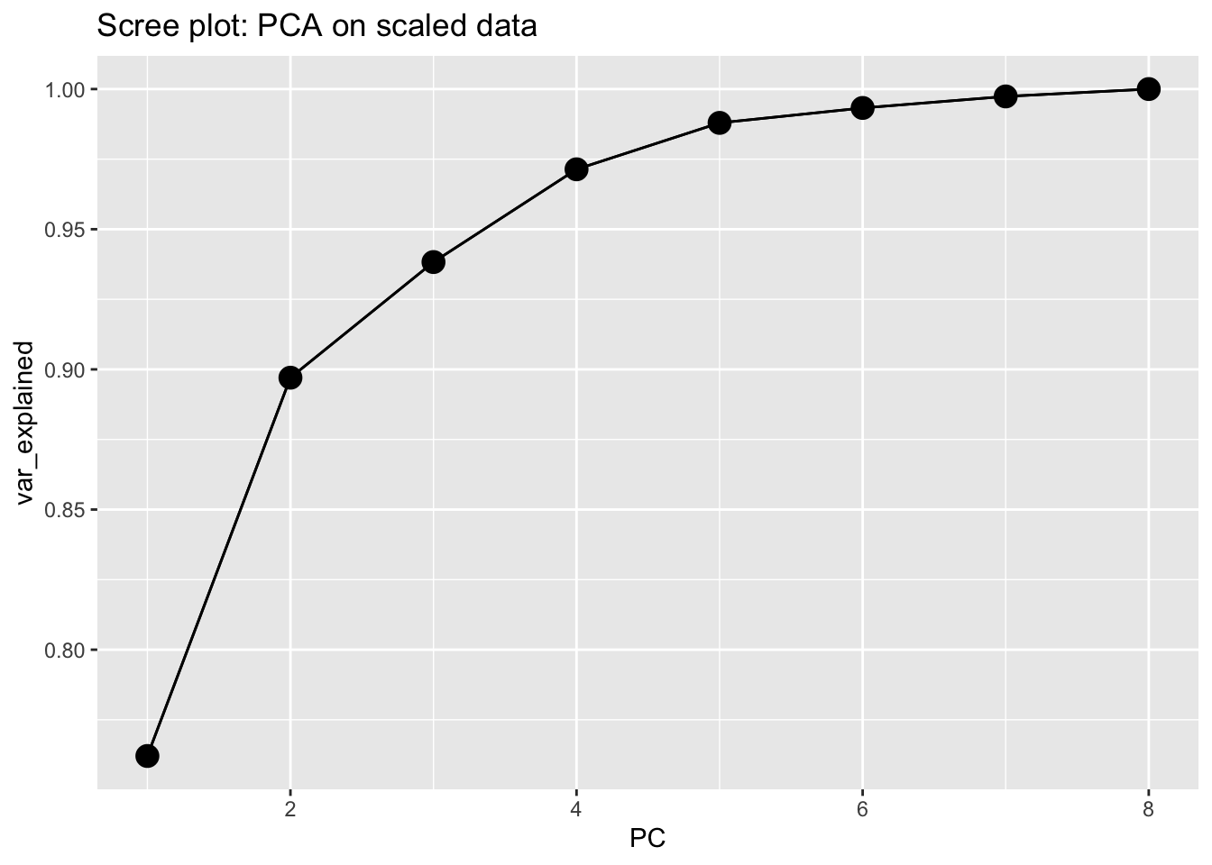 We use the following code for plotting the clustering. As we are considering 8 variables it is not possible to create a plot in 8 dimensions. The function autoplot automatically performs a dimension reduction with… PCA! The first two PC2 are used for the graphical representation. They are the same PCs that we have commented about in the previous section.