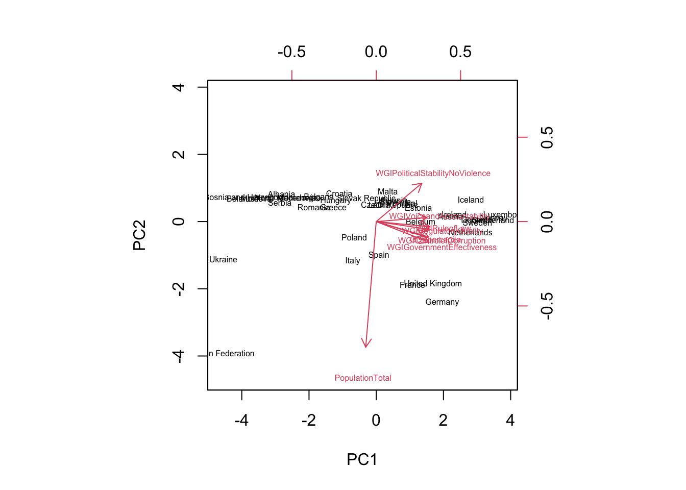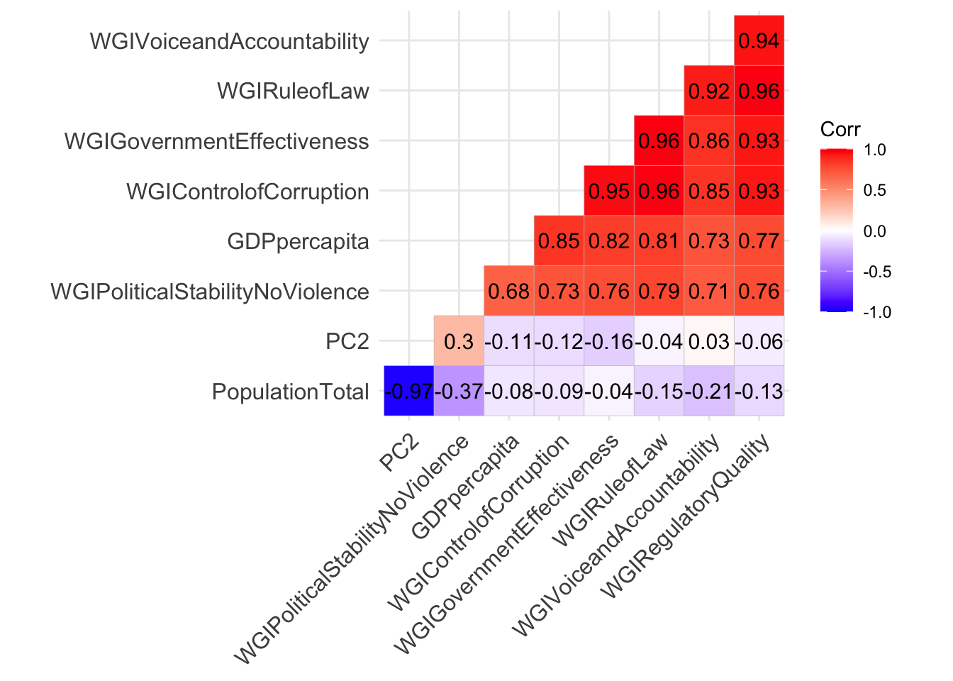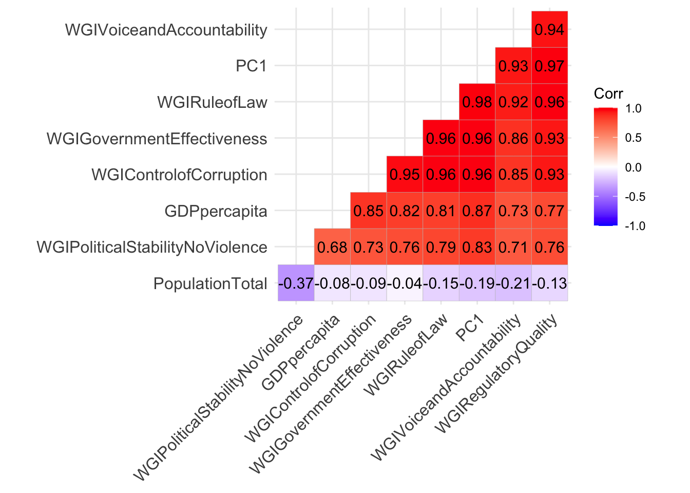 The WGI indexes are positively and strongly correlated between themselves and also with GDP. On the contrary the population size is negatively correlated with the other variables (and the correlation values are smaller in absolute value).