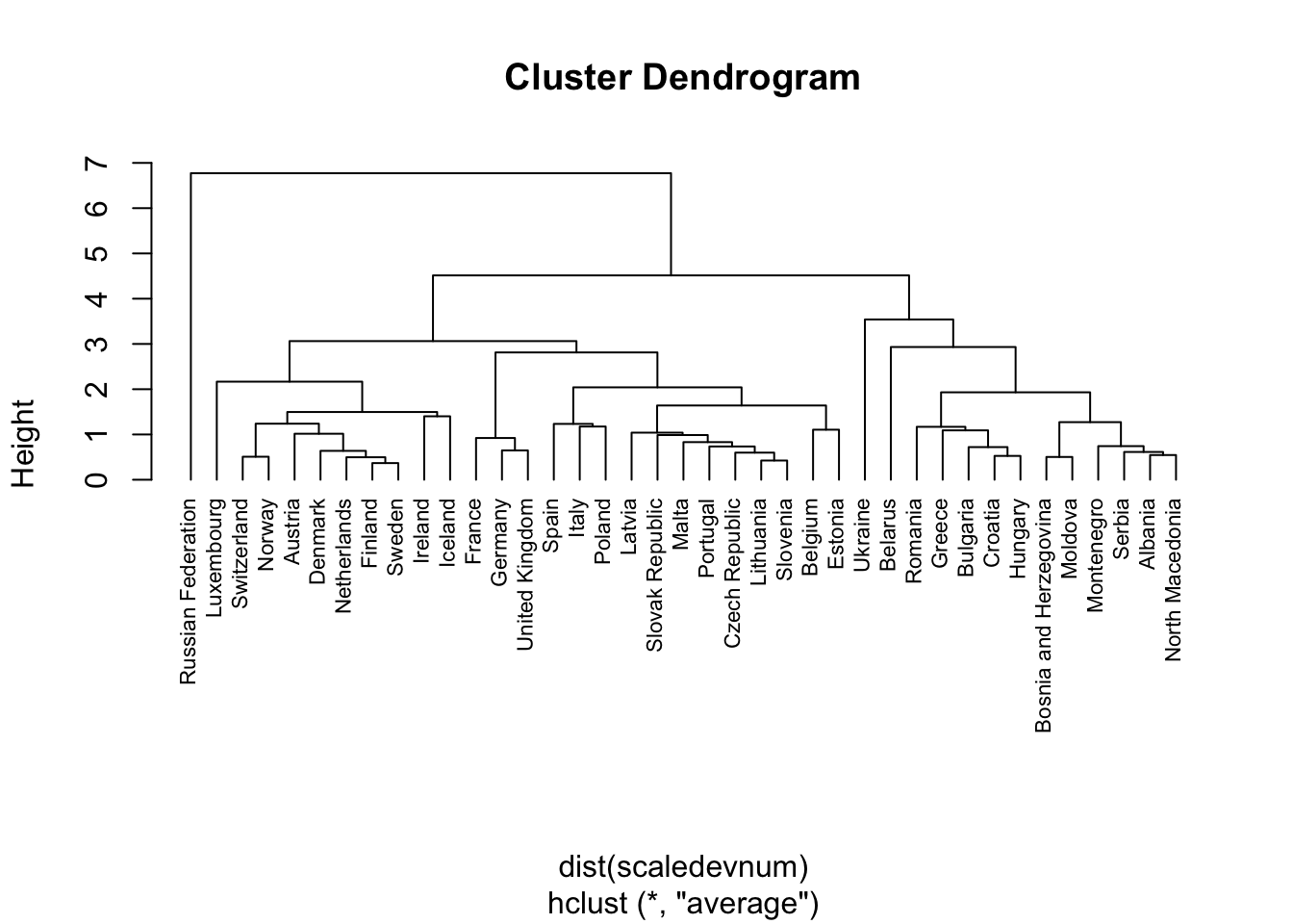 Hclusters2 = hclust(dist(scaledevnum),