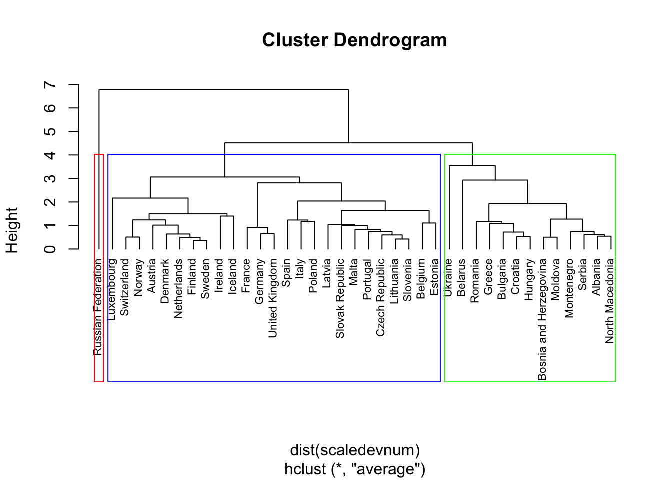 The first cluster, containing 13 countries, is the green in the dendrogram. The second cluster is composed by 25 countries including Italy (it’s the blue one). The last one is a singleton containing only the Russian Federation.