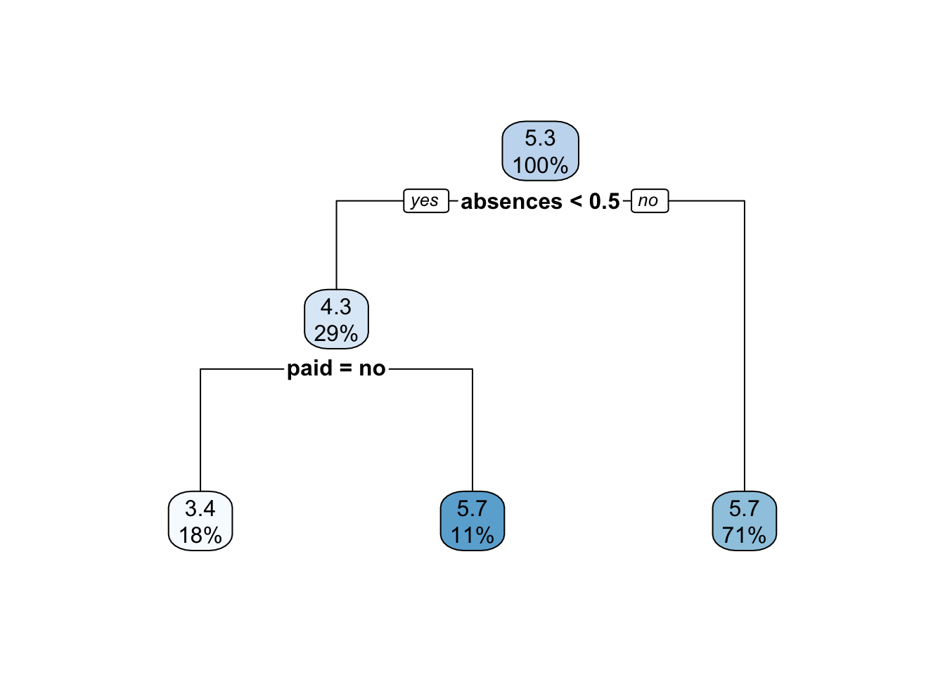 The function rpart.plot as different options about which information should be displayed. Here we use it with its default setting and each node provides the average grade and the percentage of observations in each node (with respect to the total number of observations). Note that basically all the numbers in the plot are rounded.