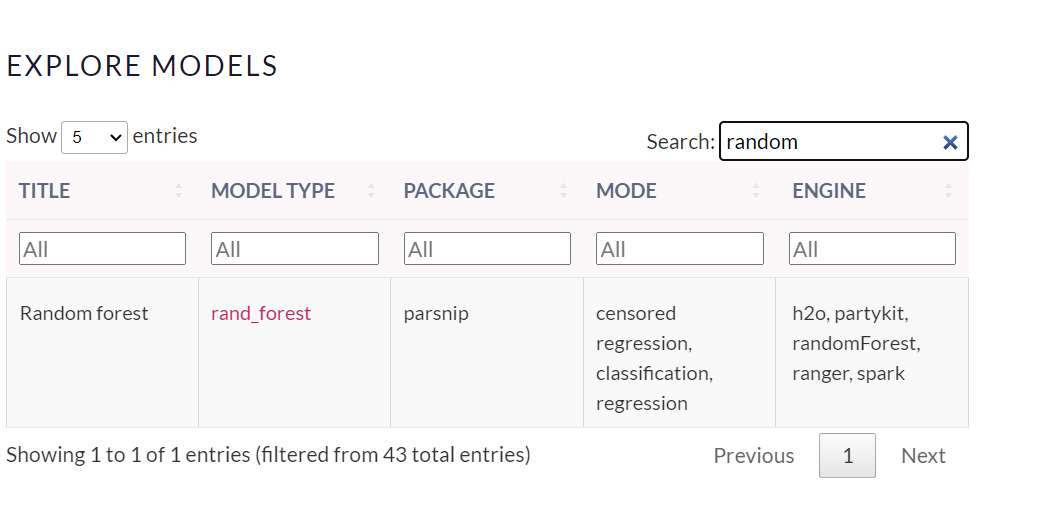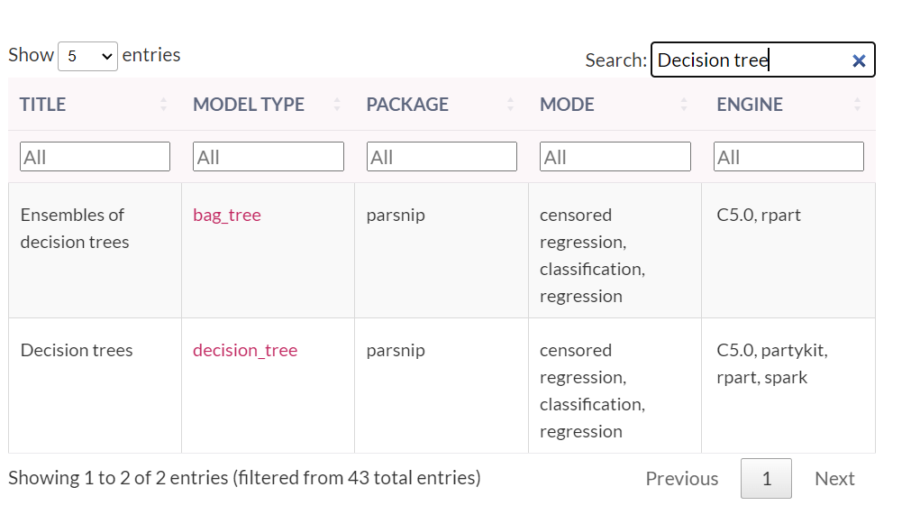 We use now the training data to estimate a regression tree by using the decision_tree function of the parsnip package (see ?parsnip). As usual it requires the specification of the engine, and the mode as you can see in the picture taken from https://www.tidymodels.org/find/parsnip/: