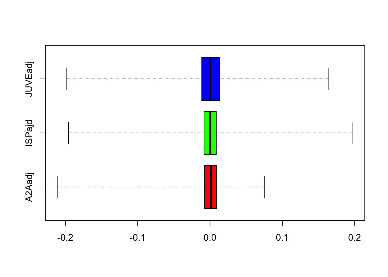 We aim to use boxplots to study and compare the available log returns distributions. It is possible to obtain a plot containing the boxplots of all the assets by using the following code: