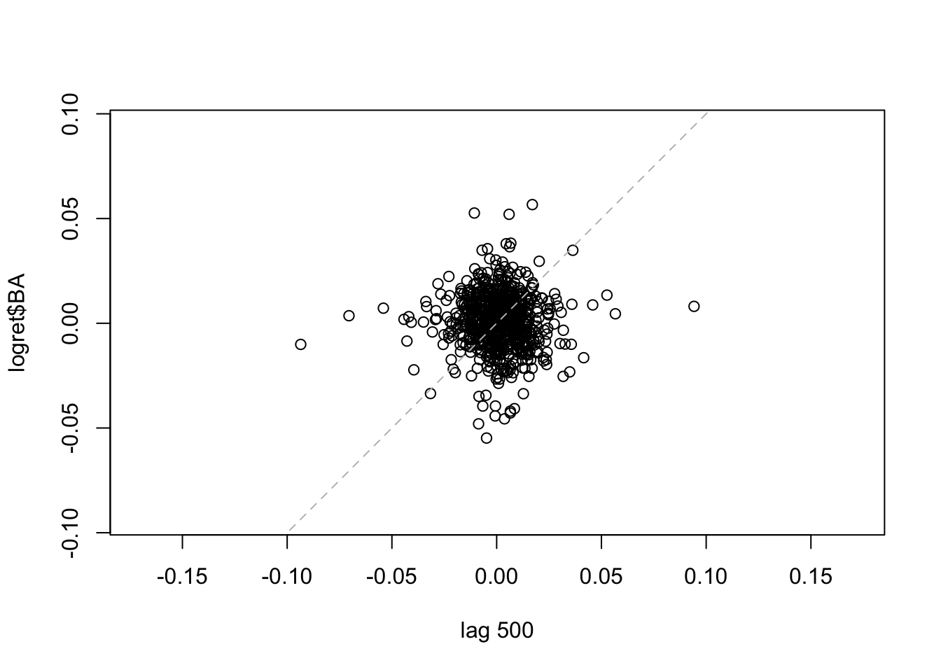 lag.plot(logret$BA, set.lags = 500) #h=500