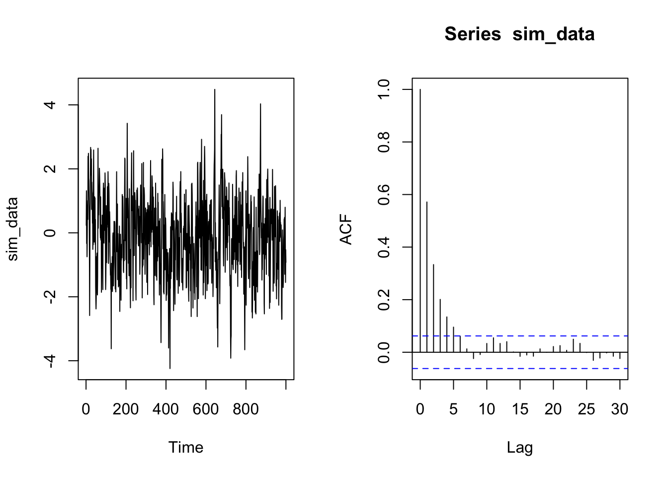sim_data<- arima.sim(n=1000,model=list(ar=0.6,ma=0))As we expect the sequence is stationary and auto-correlated, as we can deduce from the following plot: