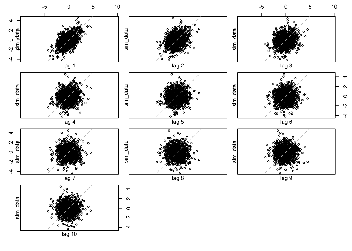 Let’s see the kind of lag.plot we obtain for an auto-correlated sequence. In the following chunk I simulate a time series from an AR\((1)\) process.