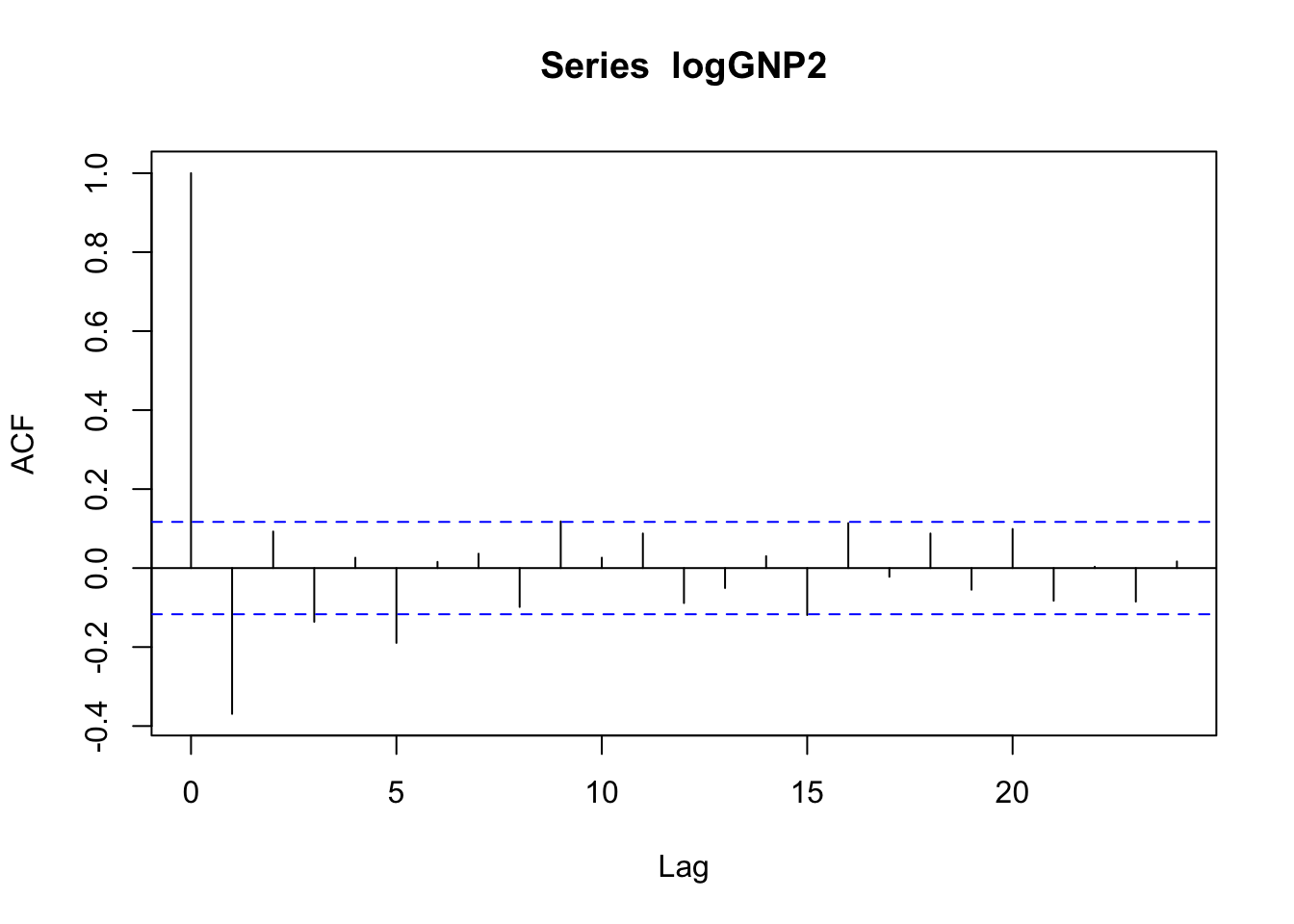 We conclude by estimating for the (non-stationary) original data (logGNP) the same model that we have identified for the (stationary) second order differences (ARMA(3,2)); it will be an ARMA(3,2,1) model: