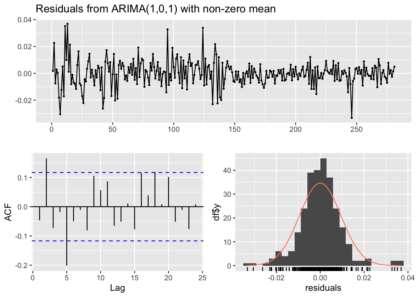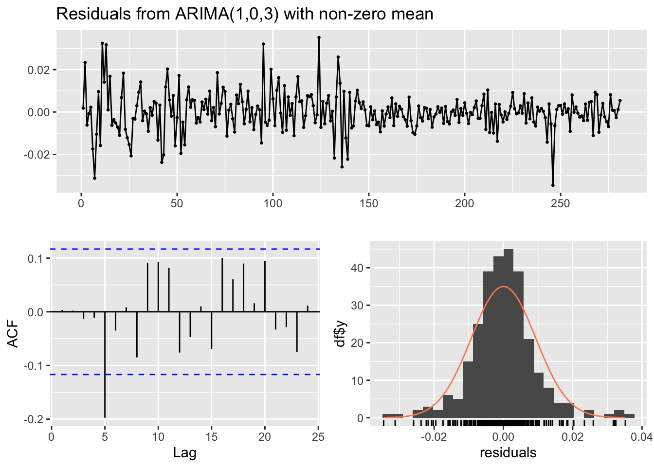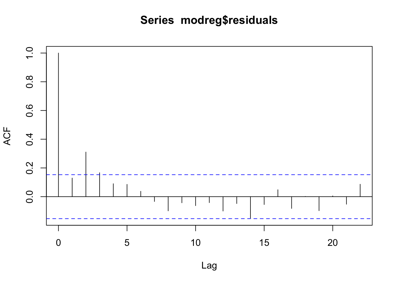 where \(u_t\) are the correlated regression errors and \(\epsilon_t\) are the ARMA errors that should be as realizations from the white-noise process. We thus check if the ARMA errors are uncorrelated: