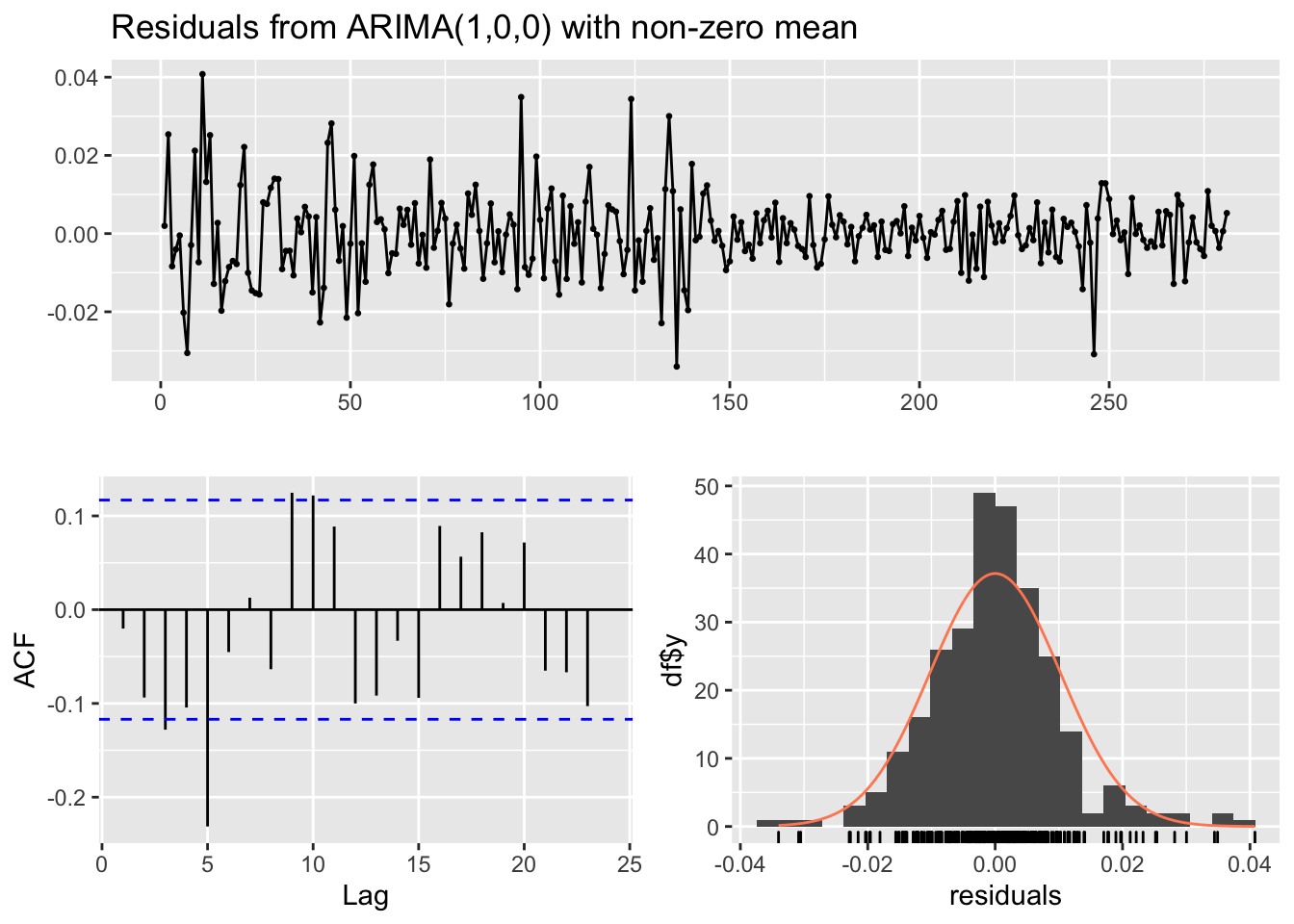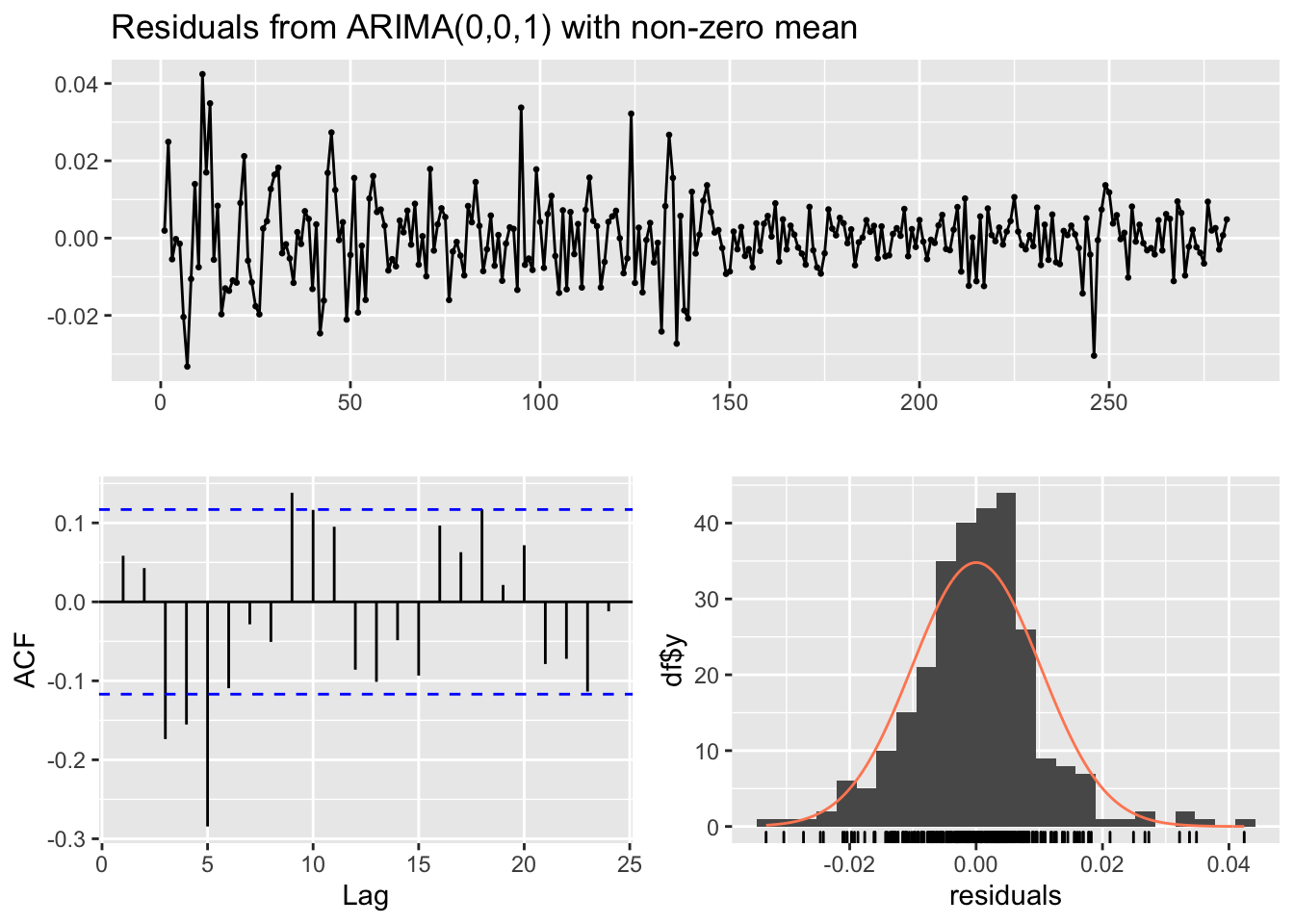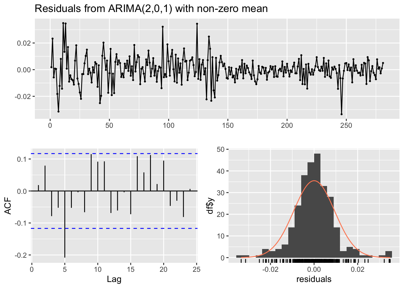 where \(u_t\) are the correlated regression errors and \(\epsilon_t\) are the ARMA errors that should be as realizations from the white-noise process. We thus check if the ARMA errors are uncorrelated: