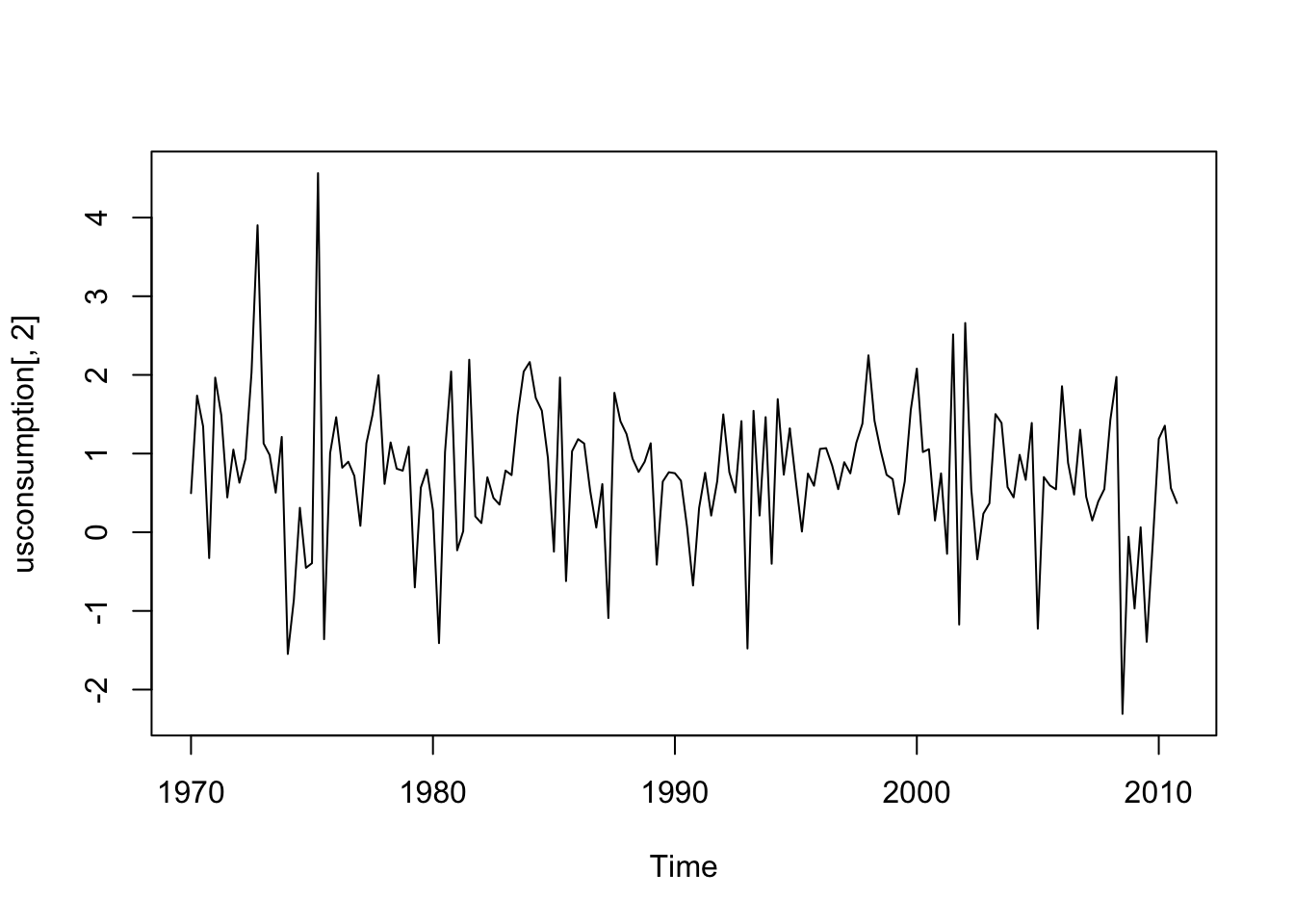 Note that the object usconsumption is of type Time-Series. For this reason in order to select a variable (i.e a column) it is not possible to use $ but we have to use square parentheses. Here below we represent graphically the two variables: