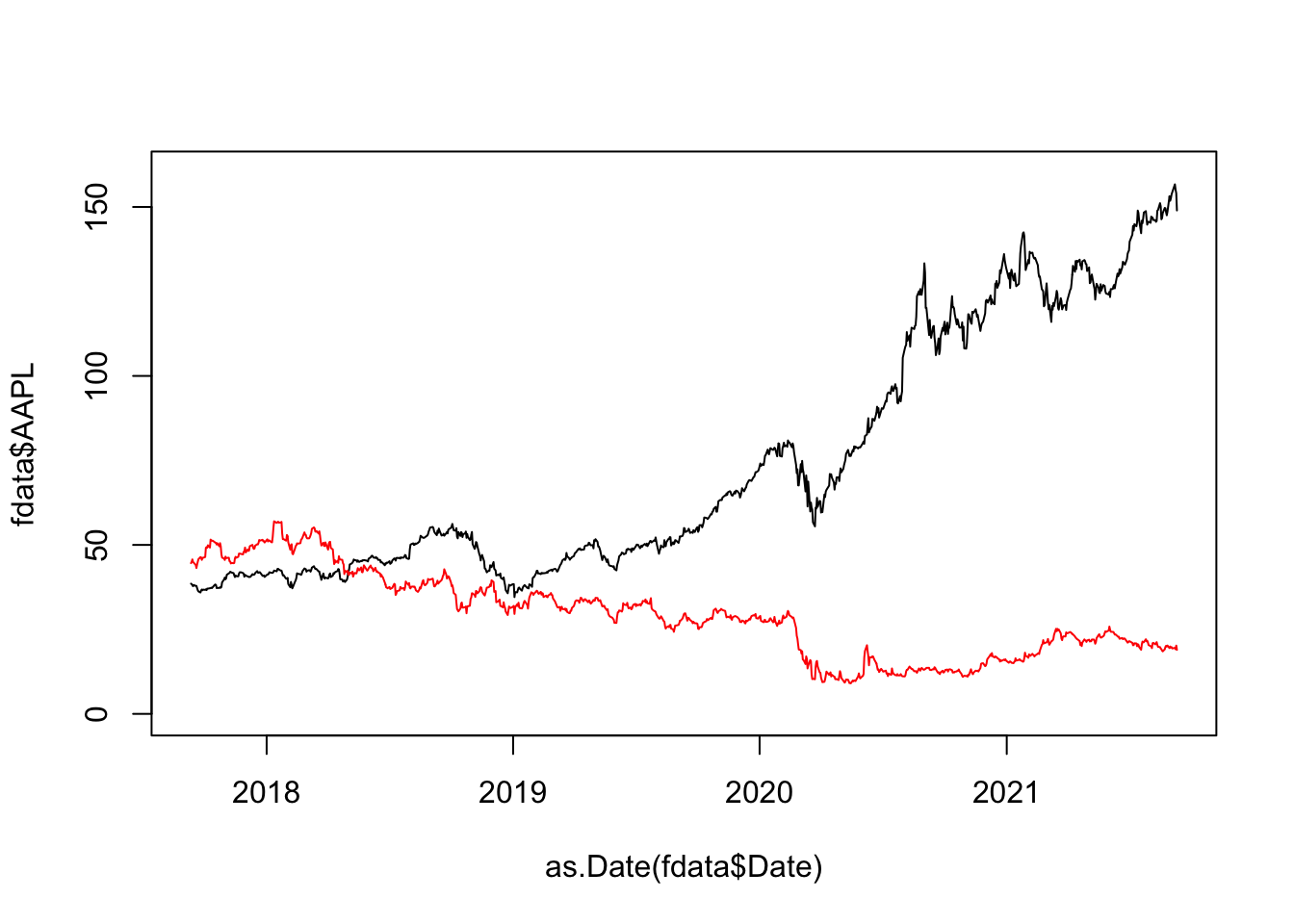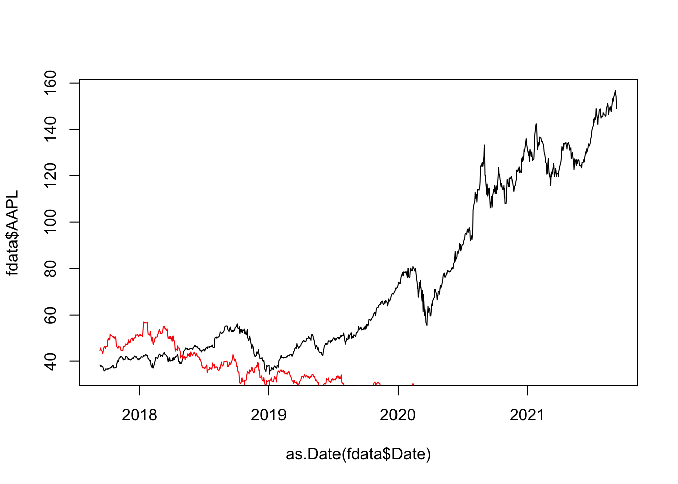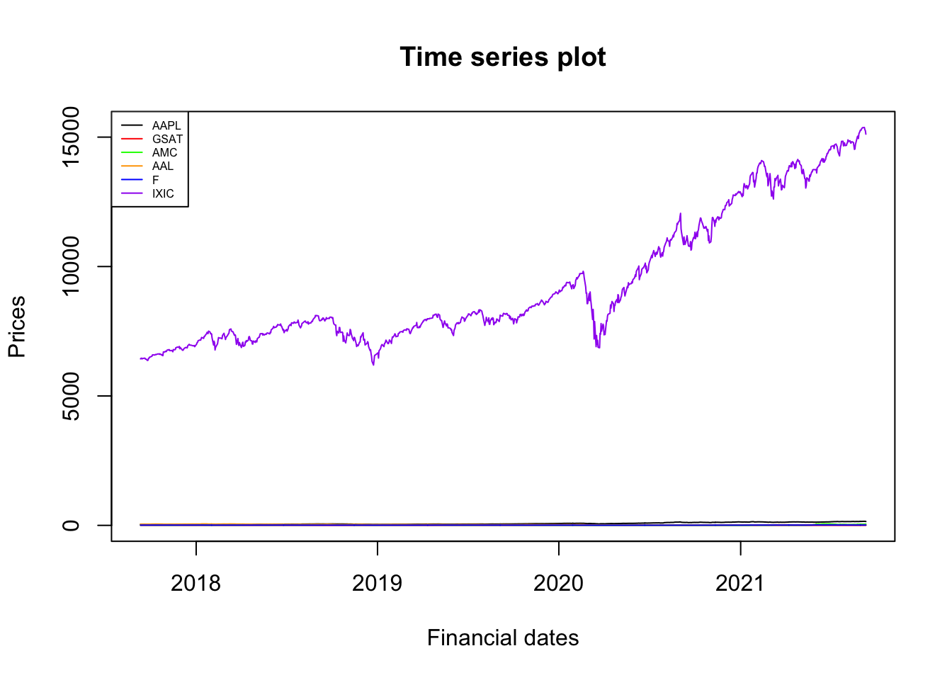 head(fdata) #preview of the first 6 lines (oldest data)## Date AAPL GSAT AMC AAL F IXIC