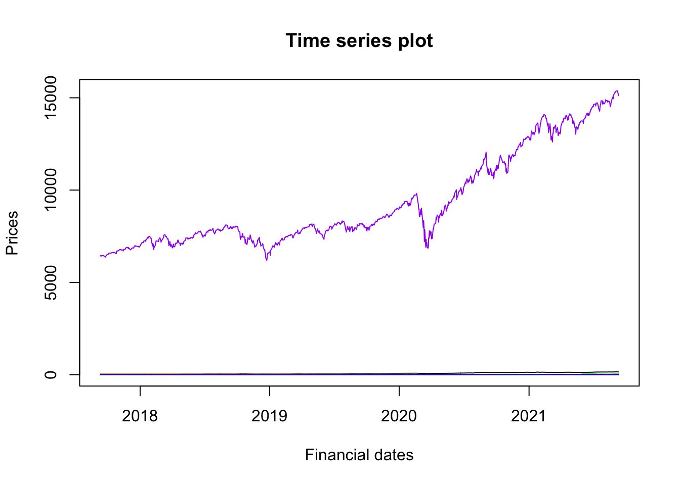 The following code is used to import the data available in the Adjcloseprices.csv file. The output is an object named fdata: