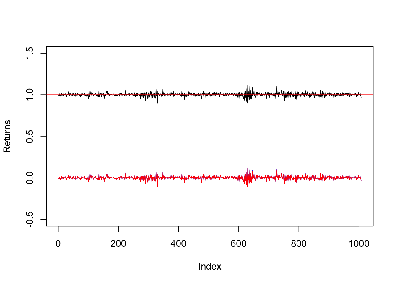 The function abline is used to add a constant horizontal line for \(y=1\) and \(y=0\) which represent the reference value for the gross and net/log returns, respectively.