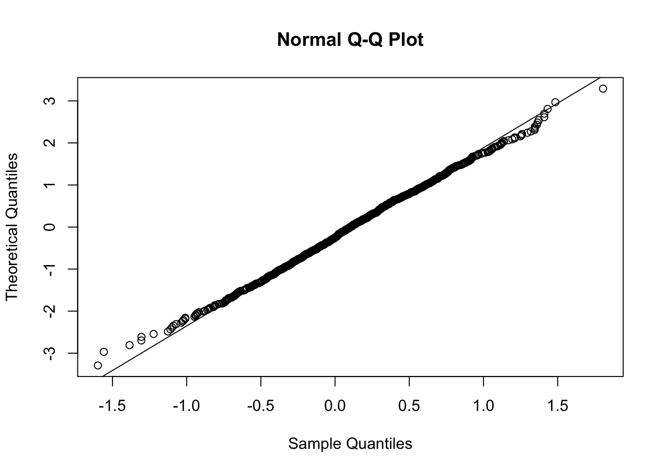 To better interpret the data, we would like to add a line going through the first and the third quantiles (empirical vs theoretical). To this end we will proceed as follows: