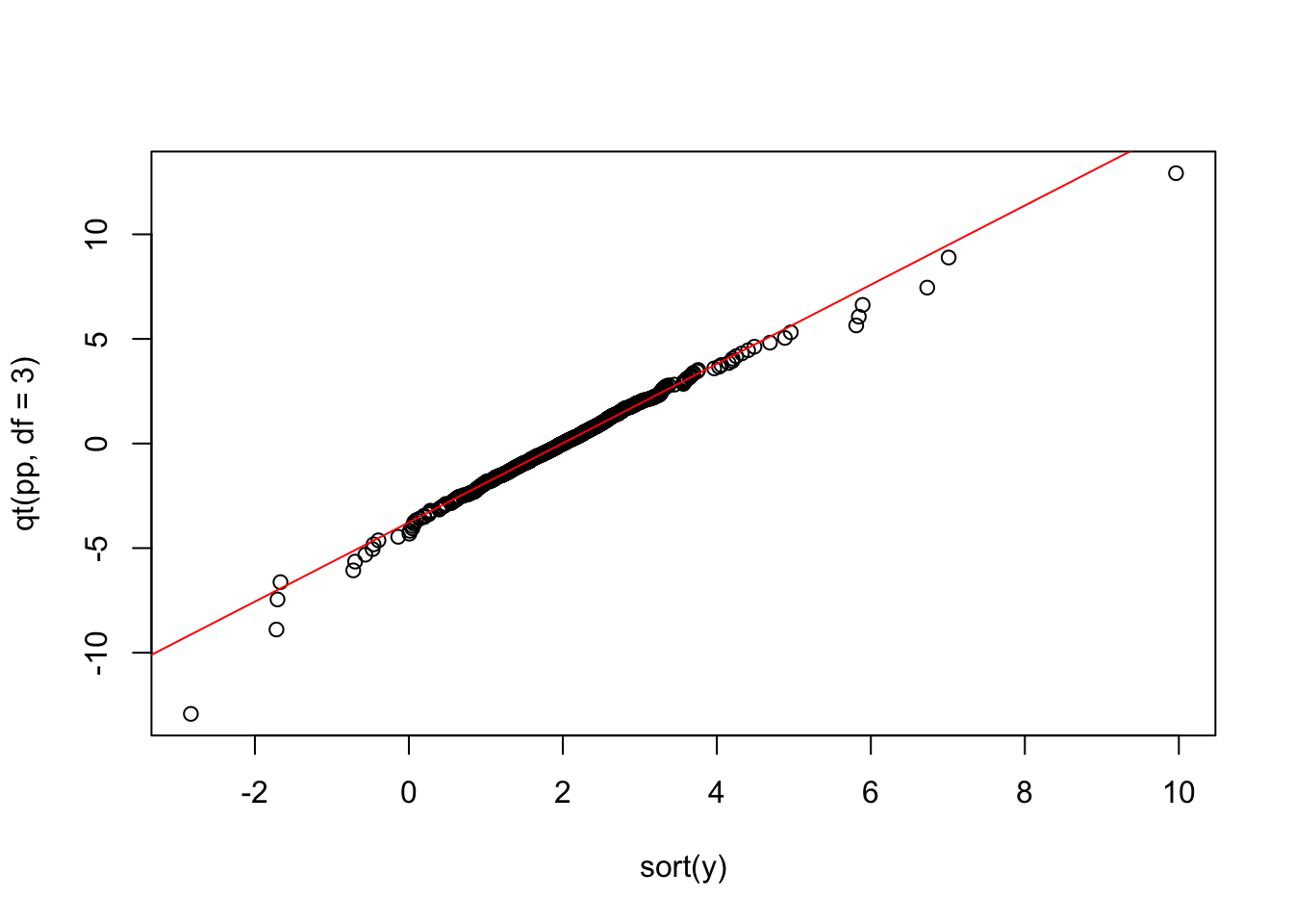 - We compute the first and third theoretical quartile (under the assumpiton of a t-student with 3 df), we denote them as \(TQ_1\) and \(TQ_2\)