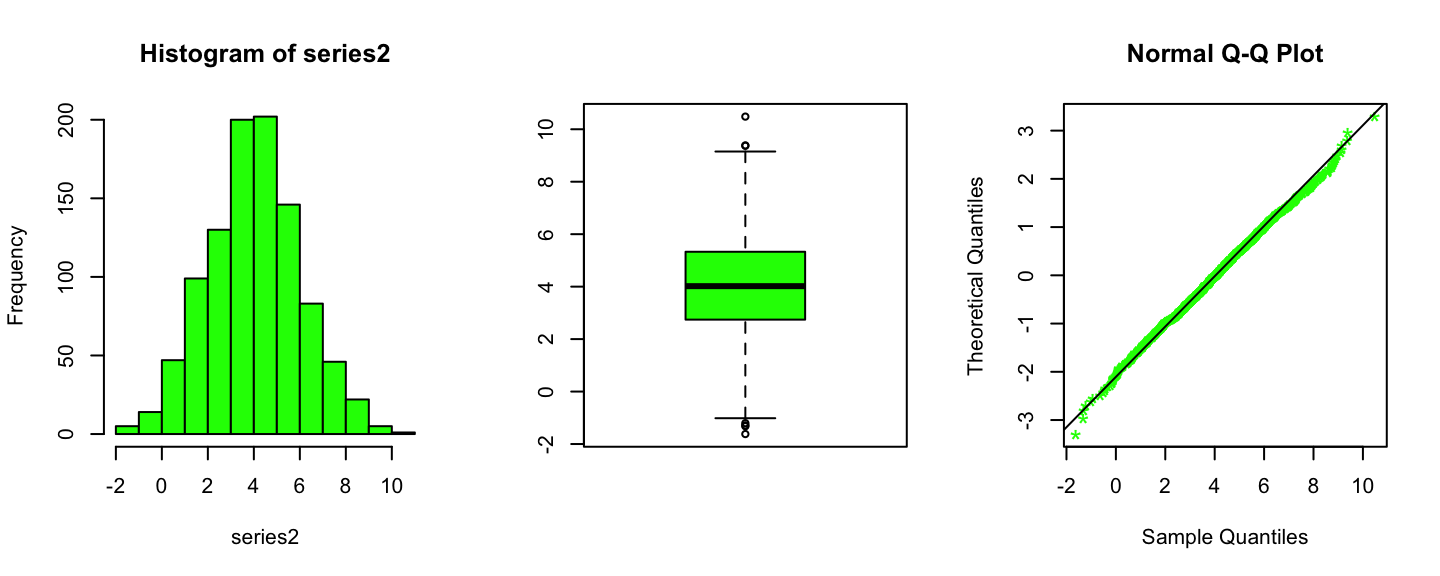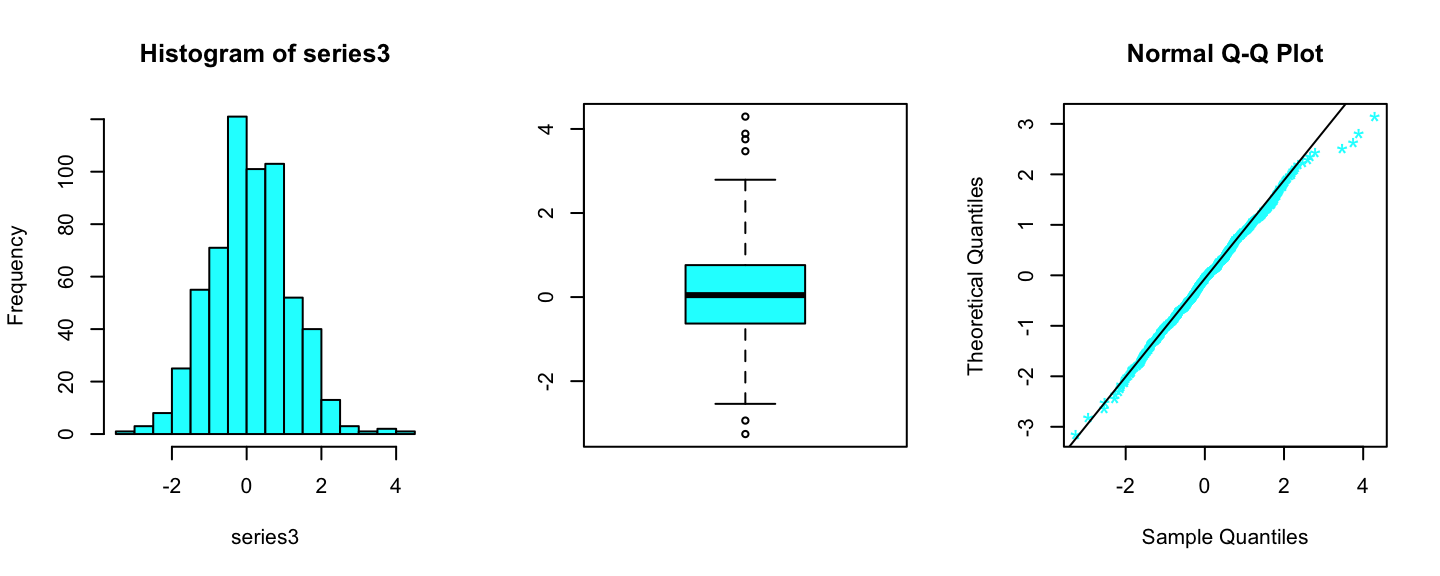 The Jarque-bera test of normality uses the sample skewness \(\hat{Sk}\) and kurtosis \(\hat{Kur}\) which are compared with the corresponding expected value (0 and 3) in case of Normal distribution. The test statistic is given by \[ JB = n\left(\frac{\hat{Sk}^2}{6}+\frac{(\hat{Kur}-3)^2}{24}\right) \] which, under the null hypothesis, is approximately distributed like a Chi-square distribution with 2 degrees of freedom (\(\chi^2_2\)). Under the null hypothesis (normality), we expect a value of the test statistic close to 0.