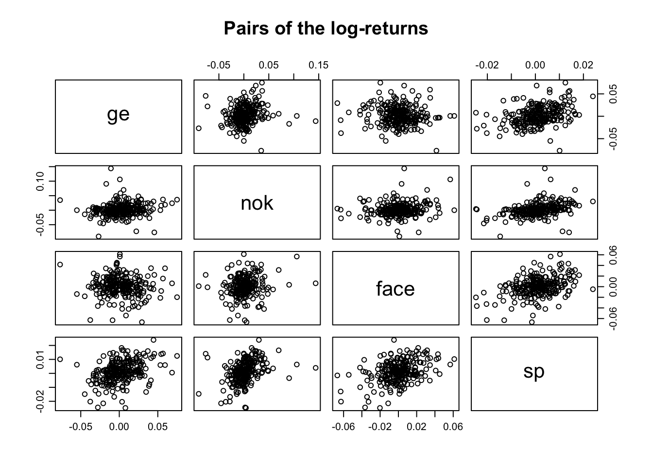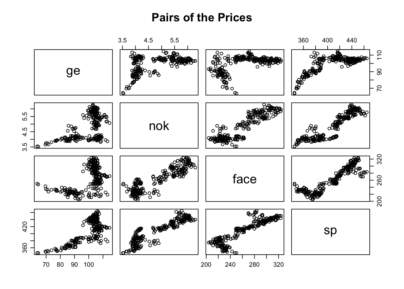 From the pairs plot we can appreciate the dependence between the prices, nevetheless, the dependence is not linear. So the correlation matrix is not properly interpretable, indeed the entries of the matrix measure the linear dependence between the corresponding pair of random variables.