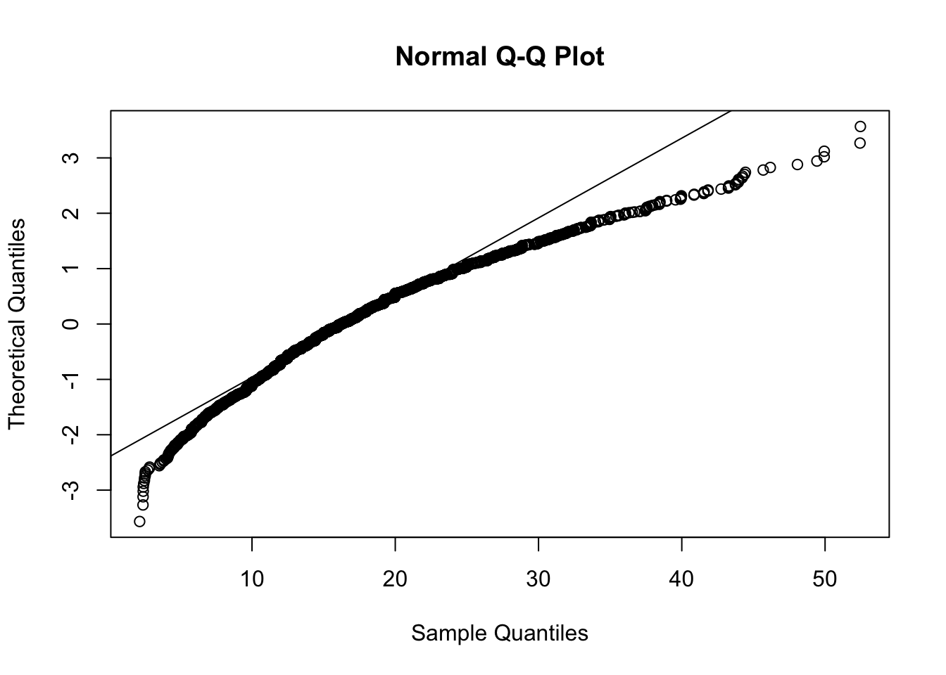The distribution appears to hava a positive skewness; this is confirmed by the fact that the mean is greater than the median and by the following normal probability plot with a concave pattern: